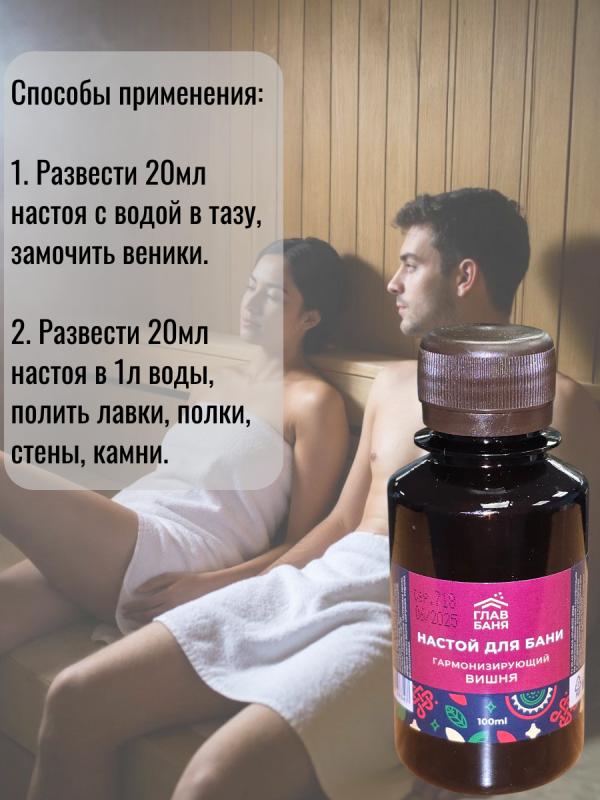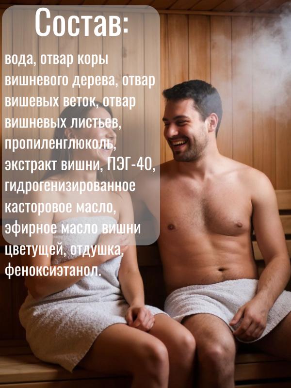 — натуральный продукт на основе отвара коры, веток и листьев вишневого дерева, а также экстрактов и эфирных масел вишни цветущей.Этот настой улучшает настроение, успокаивает и даёт ощущение гармонии с окружающим миром.Вишня помогает бороться с симптомами депрессии и восстанавливает функции крови, улучшая кровообращение.Разведите 5-10 мл настоя в литре воды, полейте получившимся раствором стены и полки парной, подайте на раскаленные камни или замочите в нем веник.Воздух парной наполнится приятным ароматом и полезными микроэлементами.Настои в бане используются еще с давних времен. Они позволяют сделать посещение бани не только приятным, но и полезным ритуалом.Воздух, обогащенный полезными веществами, благоприятно влияет не только на настроение и самочувствие, но и на кожу и волосы.