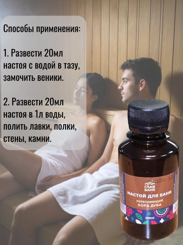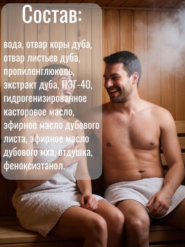 — натуральный продукт на основе экстракта листьев, отвара коры дуба и эфирного масла дубового мха.Этот настой оказывает антиоксидантный эффект на кожу, увлажняет ее, устраняет зуд и раздражение.Кора дуба укрепляет иммунитет и улучшает защитные функции организма.Разведите 5-10 мл настоя в литре воды, полейте получившимся раствором стены и полки парной, подайте на раскаленные камни или замочите в нем веник.Воздух парной наполнится приятным ароматом и полезными микроэлементами.Настои в бане используются еще с давних времен. Они позволяют сделать посещение бани не только приятным, но и полезным ритуалом.Воздух, обогащенный полезными веществами, благоприятно влияет не только на настроение и самочувствие, но и на кожу и волосы.