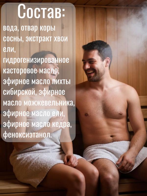 Основная составляющая ароматизатора эфирные масла хвойных пород. Они помогают бороться с простудными заболеваниями, обладают противовирусными, обезболивающими, общеукрепляющими свойствами и являются отличными антисептикамиНастой для бани и сауны с традиционным хвойно-древесным ароматом, бодрит и оказывает общеукрепляющие воздействие на организм. Настой предназначен для запаривания веников и подачи, в разбавленном с водой виде, на каменку и деревянные поверхности