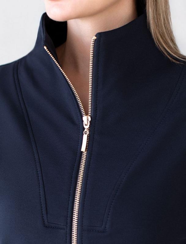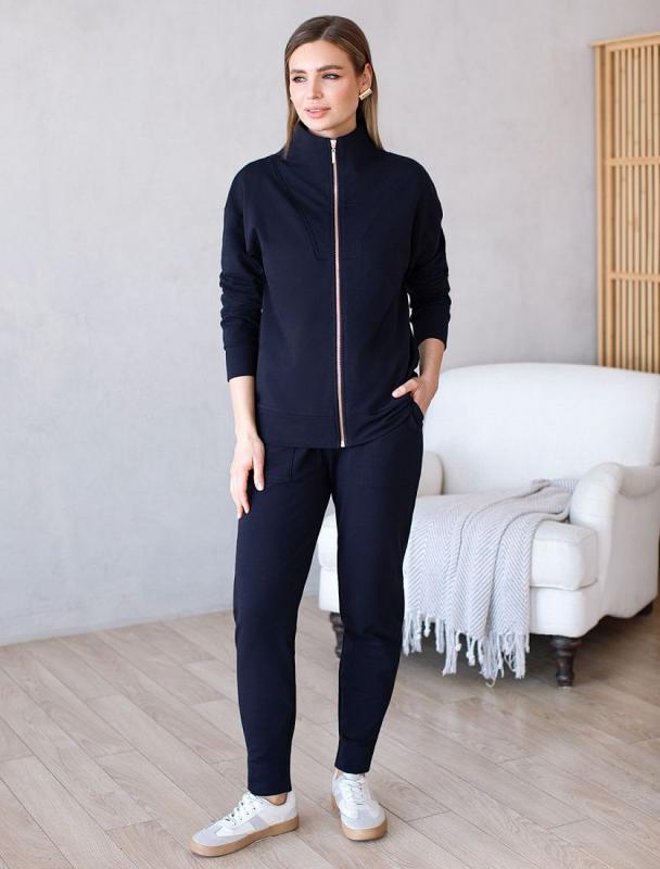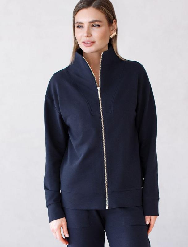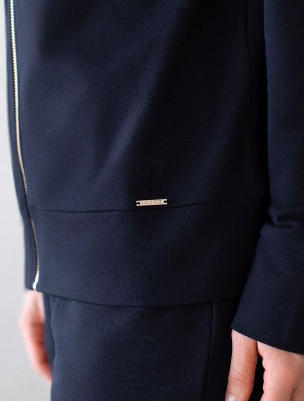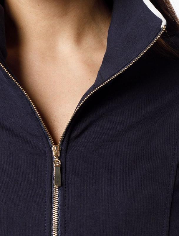 Жакет выполнен из футера двухнитки с эластаном. Модель без карманов с воротом стойка и застежкой на молнию золотистого цвета. Эластичный материал гарантирует комфорт и формоустойчивость. Сочетается в костюме с брюками D44.138, D44.139, D44.140 и шортами D48.008. Изделие дополнено металлическим логотипом бренда.
