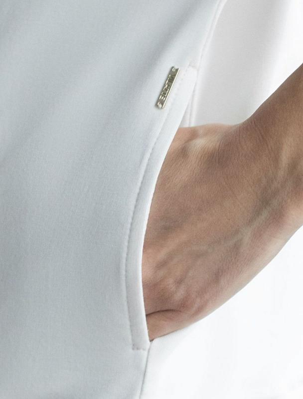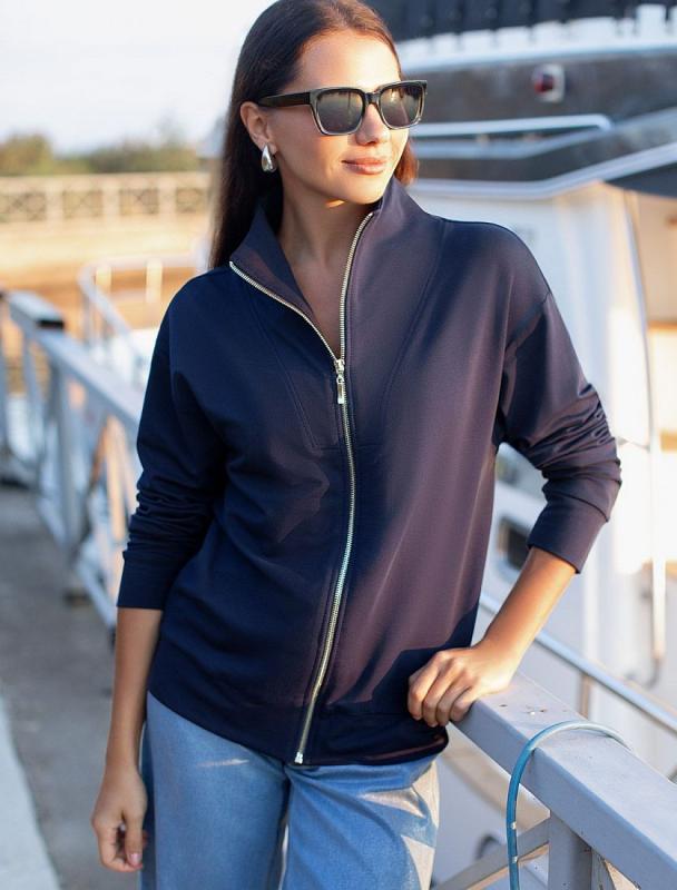 Джемпер среднего объема со спущенным плечом выполнен из футера двухнитки с эластаном. Изделие с воротом на серебристой молнии дополнено боковыми карманами. Эластичный материал гарантирует комфорт и формоустойчивость. Сочетается в костюме с брюками D44.138, D44.139 и шортами D48.008. Изделие дополнено металлическим логотипом бренда.