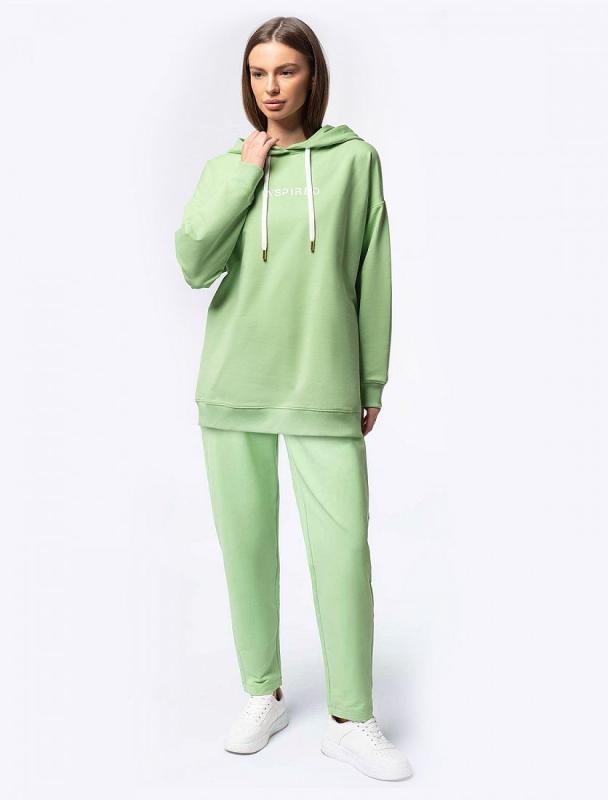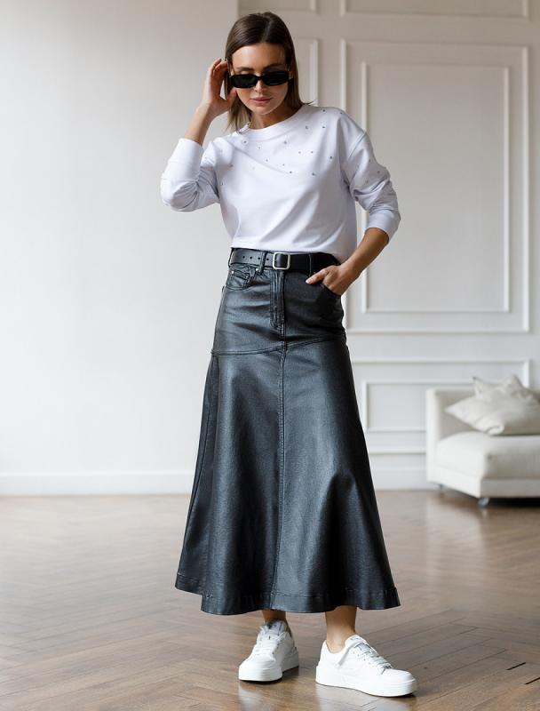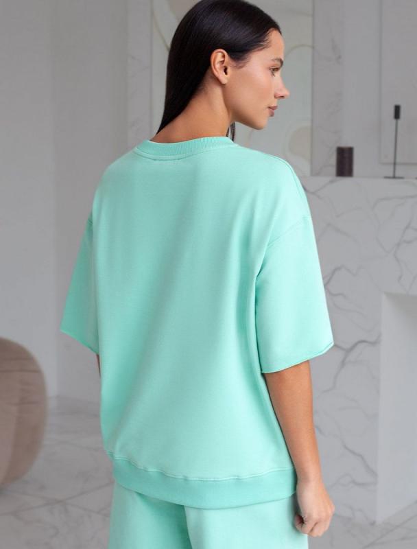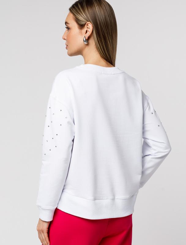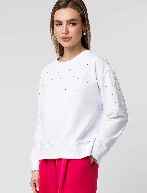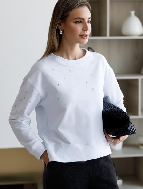 Свитшот выполнен из эластичного футера двухнитки. Изделие дополнили лаконичным принтом стразами в тон изделия. Расслабленный стиль поддерживает спущенная линия плеча, свободный силуэт и разрезы по бокам. Модель сочетается в костюме с брюками D44.135, D44.136, D44.137 и юбкой D46.034