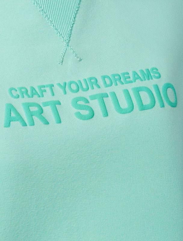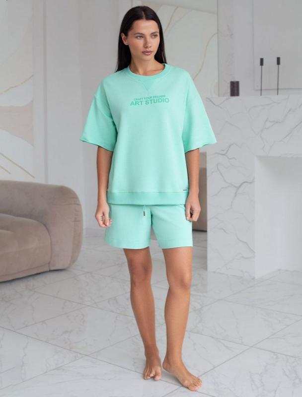Перевод принта: Craft your dreams, art studio - стань скульптором своей мечты. Футболка свободного кроя со спущенным плечом выполнена из футера двухнитки с эластаном. Лаконичный принт нанесен фактурной краской. Эластичный материал гарантирует комфорт и формоустойчивость. Сочетается в костюме с брюками D44.138, D44.139 и шортами D48.008. Изделие дополнено металлическим логотипом бренда.