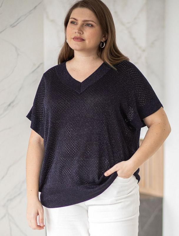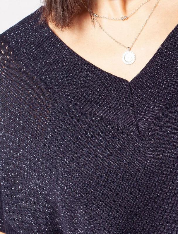 Джемпер со спущенным плечом выполнен фактурной вязкой из вискозы с мягким люрексом. Внутренняя сторона изделия без люрекса, абсолютно гладкая и комфортная даже на голое тело. V-вырез подчеркивает линию шеи. Свободный силуэт подходит для любой фигуры. Праздничная сияющая модель дополнена металлическим логотипом бренда