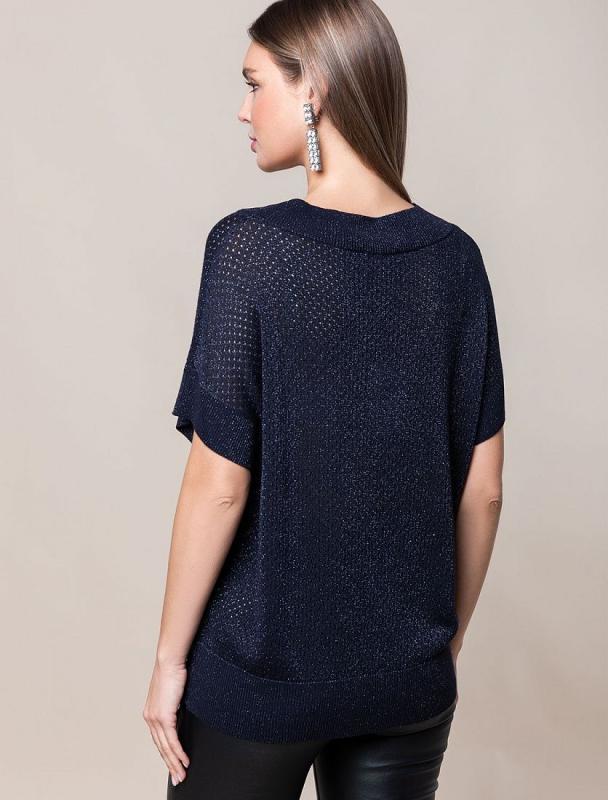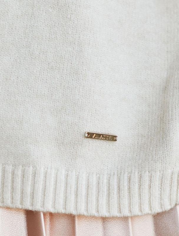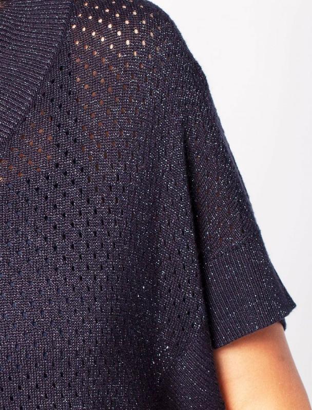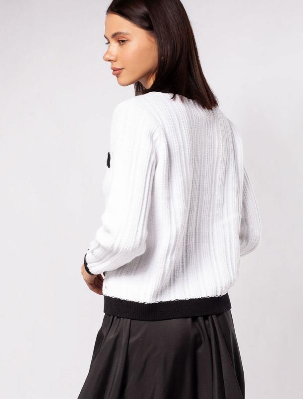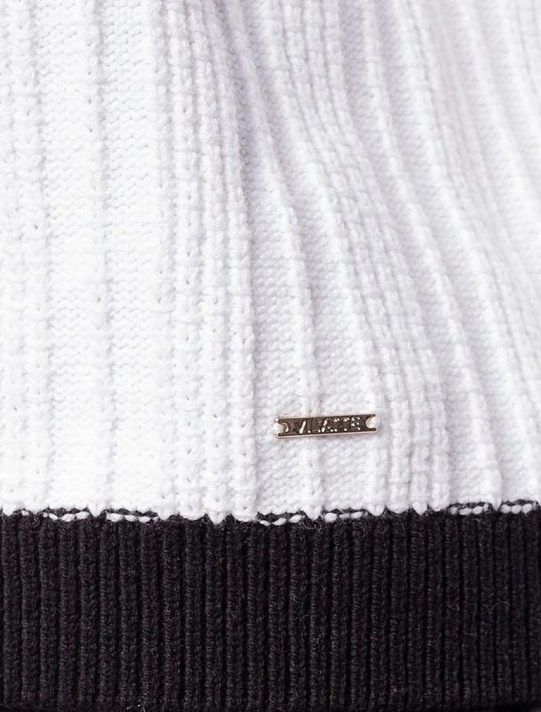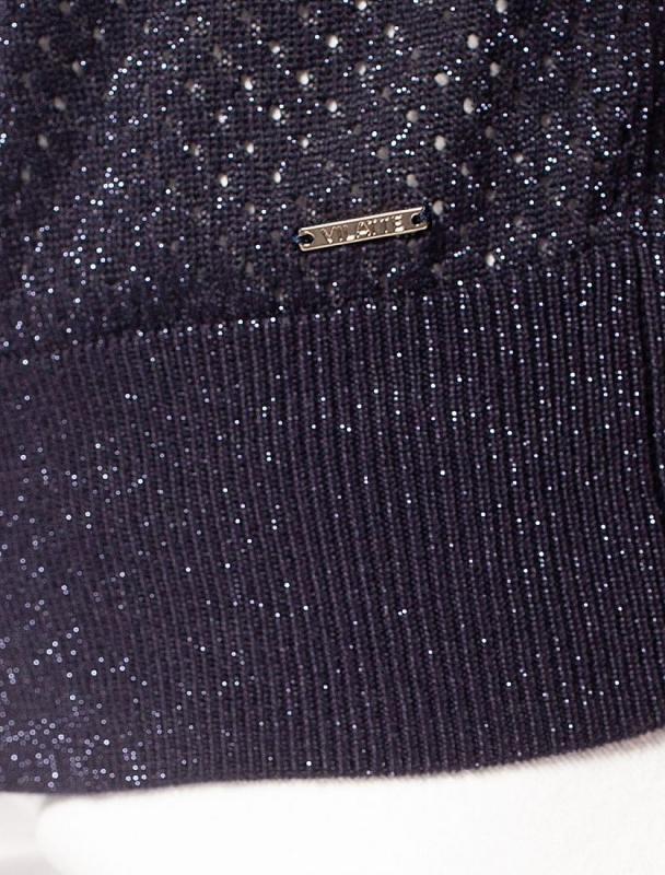 Свитер фактурной вязки выполнен из эластичного трикотажа на основе вискозы. Добавление в состав пряжи мягкого люрекса создает праздничное сияние. Изюминка модели – контрастное сочетание на манжетах и по нижнему краю. Идеально сидит по фигуре, подчеркивая силуэт. Изделие не колется и комфортно в носке даже на голое тело. Дополнительным украшением служит металлический логотип бренда.