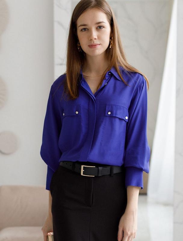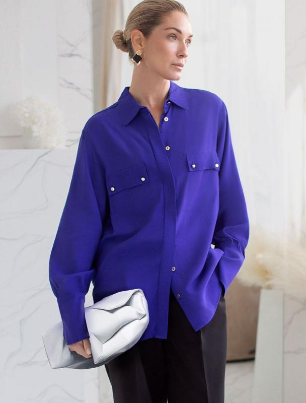 Блузка с имитацией карманов и удлиненными манжетами выполнена из премиальной вискозы и лиоцелла. На спинке изделия фирменный логотип бренда. Имитация карманов позволяет этому элементу выглядеть аккуратно без складок и фалд, которые вероятны на такой пластичной ткани.Застежка на золотистые пуговицы. Приятная на ощупь ткань охлаждает кожу в жаркую погоду. Отлично впишется в нестрогий офисный дресс-код или в расслабленном повседневном образе с джинсами.