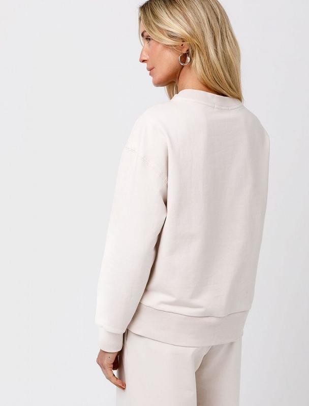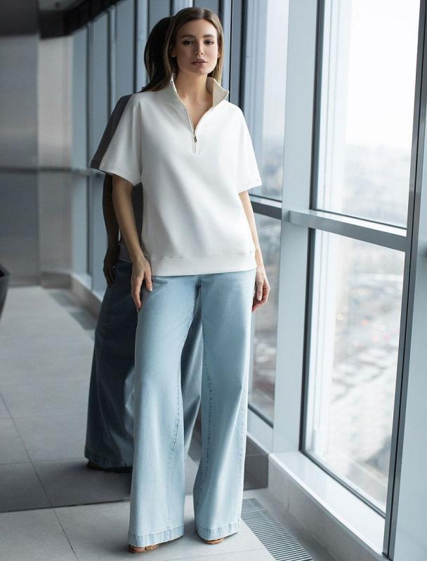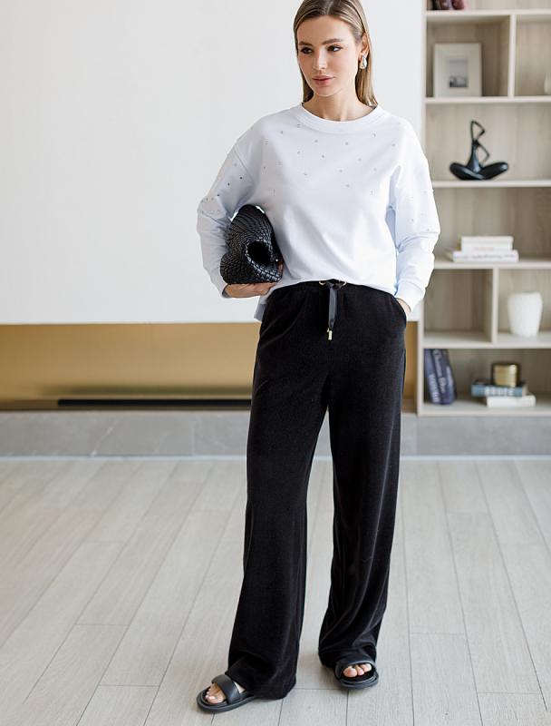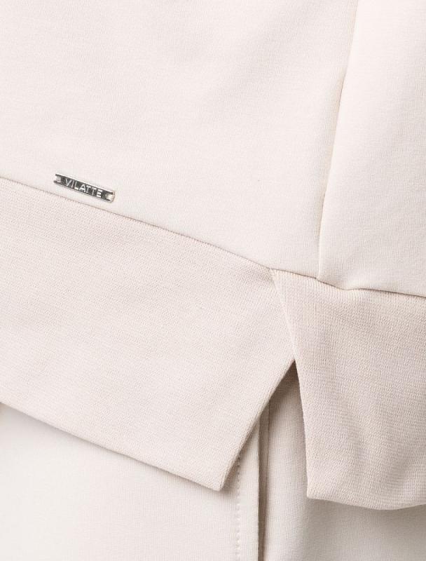 Свитшот выполнен из эластичного футера двухнитки. Изделие дополнили лаконичным принтом стразами в тон изделия. Расслабленный стиль поддерживает спущенная линия плеча, свободный силуэт и разрезы по бокам. Модель сочетается в костюме с брюками D44.135, D44.136, D44.137 и юбкой D46.034, D46.036