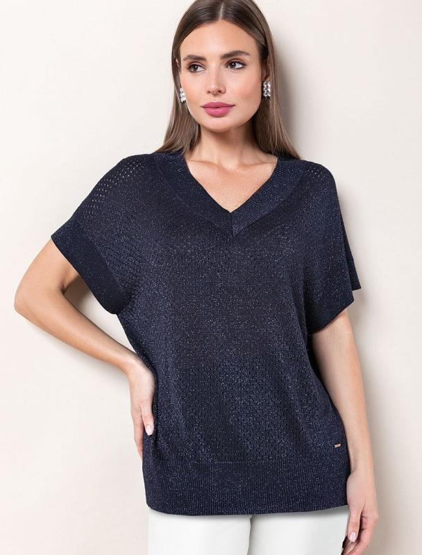Свободная блузка из из весенне-летней коллекции в глубоком темно-синем оттенке. Для пошива модели использовали струящуюся ткань на основе лиоцелла, который особенно хорошо пропускает воздух и охлаждает кожу на несколько градусов. Добавление синтетических волокон в составе изделия предотвращает сминаемость. Застежка на пуговицы из натурального перламутра. На спинке кокетка с фирменным логотипом бренда. Соберите свой костюм с шортами D28.318