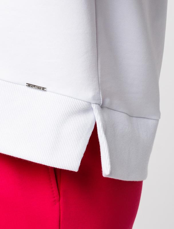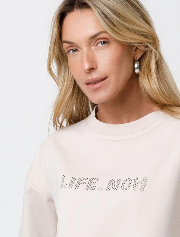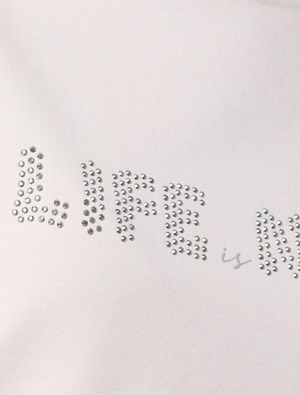 Свитшот выполнен из эластичного футера двухнитки. Изделие дополнили аппликацией из металлических страз. Перевод: Life is now - живи сейчас. Расслабленный стиль поддерживает спущенная линия плеча, свободный силуэт и разрезы по бокам.