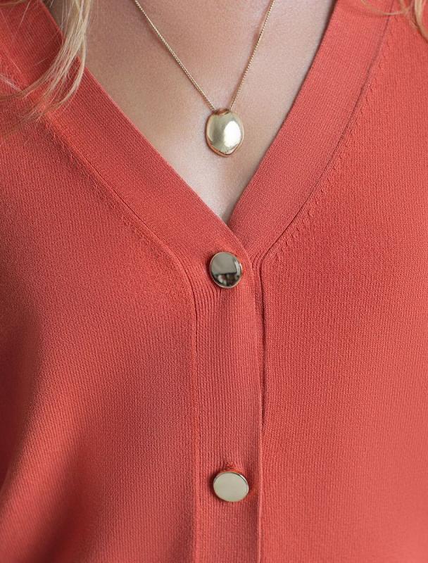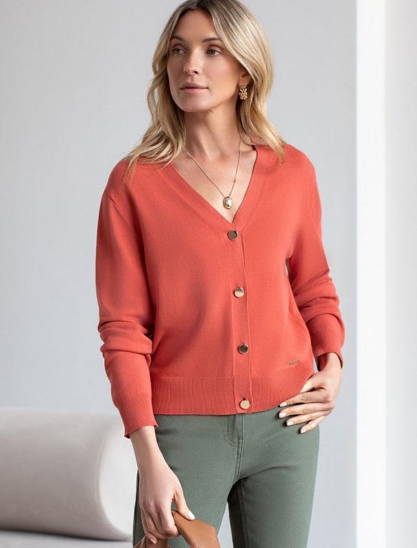 Жакет тонкой вязки выполнен из вискозы с нейлоном. Модель с V- вырезом дополнена золотистыми пуговицами и фирменным металлическим логотипом бренда. Мягкая пряжа приятная к коже позволяет носить изделие как первый слой, а также рекомендуем использовать как кардиган в многослойных образах поверх топа или платья.