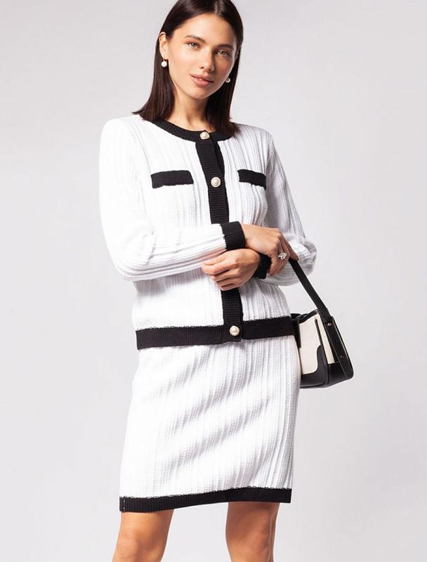 Платье длины мини с воротником поло выполнено из мягкого трикотажа на основе шелковистой эластичной вискозы. Жаккардовое переплетение образует геометрический узор. Застежка на перламутровые пуговицы подчеркивает гладкость пряжи. Контрастный воротник и манжеты делают узор еще более выразительным. Можно сочетать с жакетом D31.388 из жаккардовой коллекции.