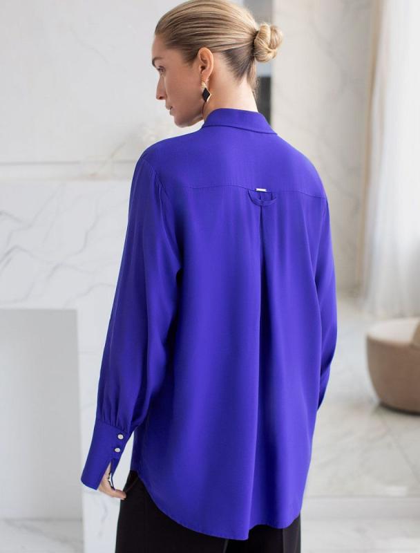 Свободная блузка выполнена из плотного лиоцелла. Модель дополнена золотистыми пуговицами-запонками с эмалью. Основная застежка-планка на потайные пуговицы из натурального перламутра. Добавление синтетических волокон в составе изделия предотвращает сминаемость. На спинке металлический логотип бренда.