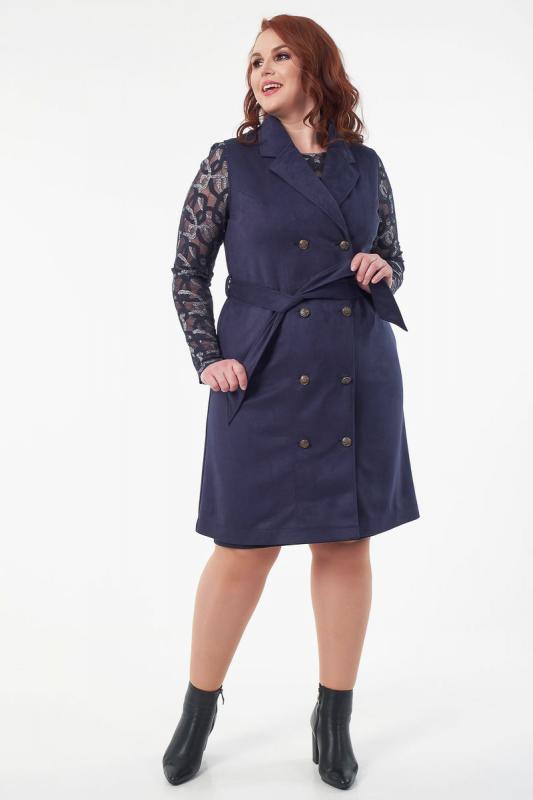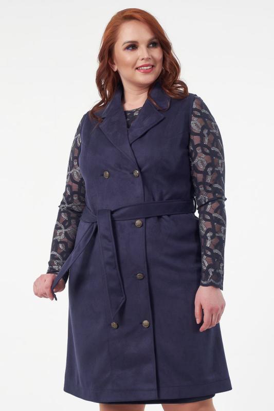 Роскошный удлиненный жилет полуприлегающего силуэта из замшевого полотна на трикотажной основе синего цвета. Вырез изделия обработан двойным отложным воротничком. Перед изделия дополнен планкой с застежкой на пуговицы. К жилету прилагается пояс. Аксессуары в комплект не входят. Длина изделия по спинке от плечевого шва до низа изделия — 105 см. Рост фотомодели - 174 см.