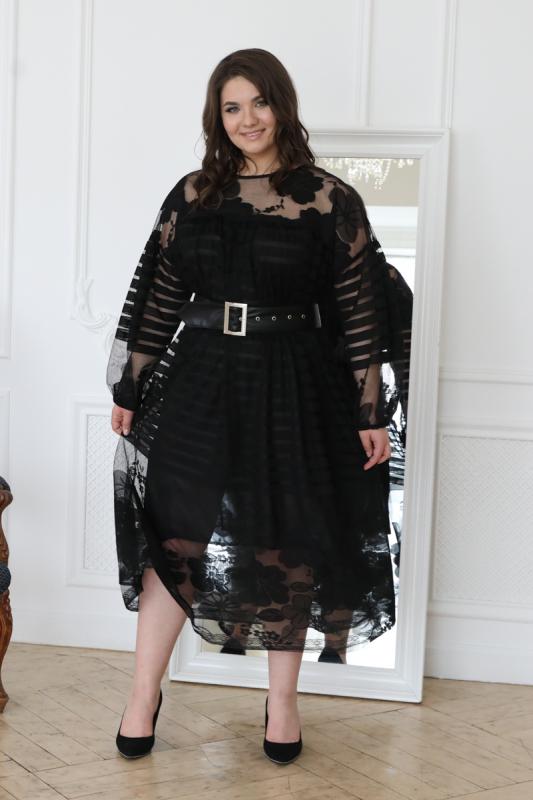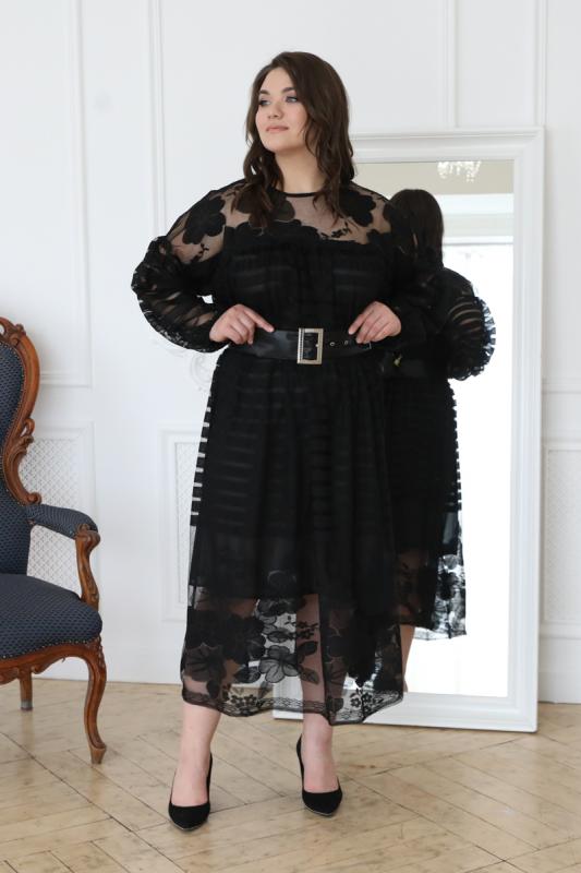 обработан косой бейкой. Платье с цельнокроенными рукавами. Платье двойное: верхняя часть выполнена из кружевного полотна, снизу выше линии груди пришит однотонный подклад из трикотажного полотна черного цвета. Ремень в комплект не входит. Длина изделия по спинке от плечевого шва до низа изделия — 125 см. Рост фотомодели — 170 см.