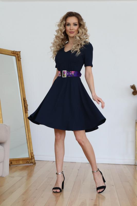 Стильное платье прилегающего силуэта из трикотажного полотна синего цвета. V-образный вырез изделия обработан широкой окантовкой . Платье с втачными рукавами. В комплект входит атласный пояс с металлической пряжкой. Длина изделия по спинке от плечевого шва до низа изделия — 94 см. Рост фотомодели — 170 см.