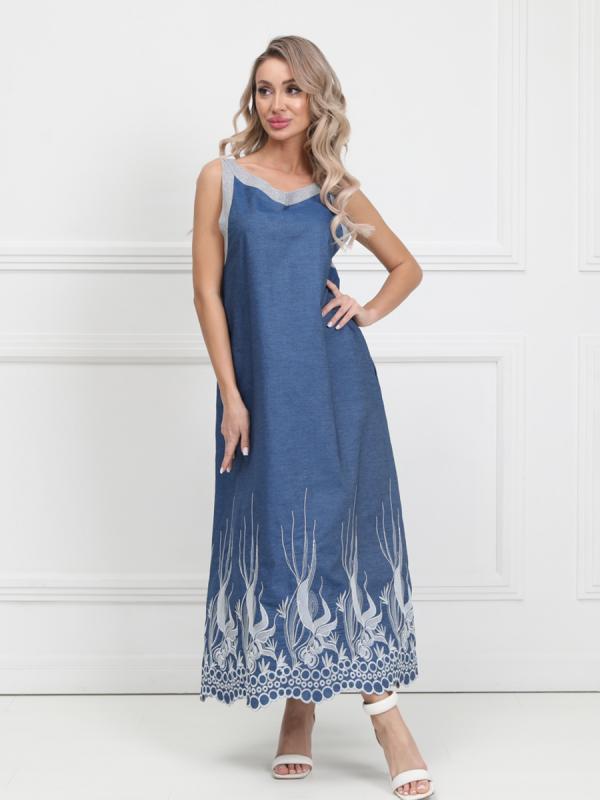 Роскошный сарафан полуприлегающего силуэта из текстильной ткани (хлопок). Фигурный вырез изделия и проймы рукавов обработаны контрастными трикотажными подвязами. По бокам изделия - внутренние карманы. Длина изделия по спинке от плечевого шва до низа изделия — 120 см. Рост фотомодели — 170 см.