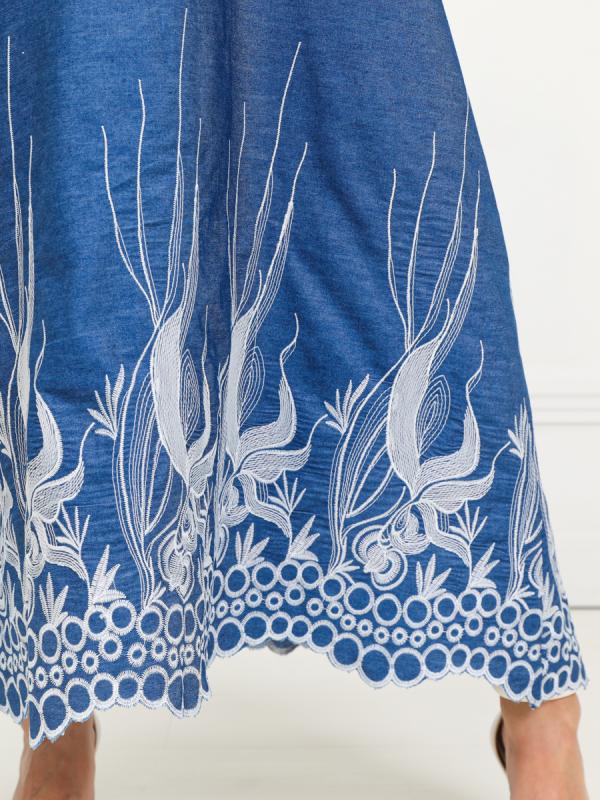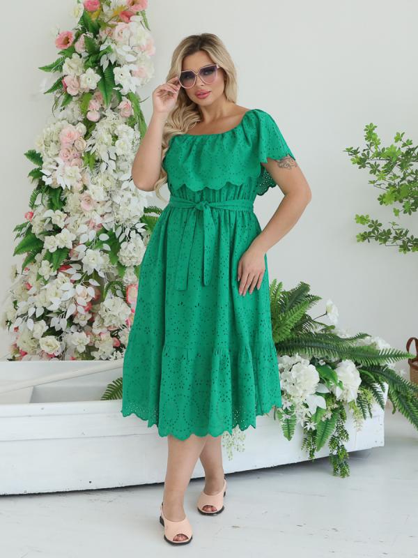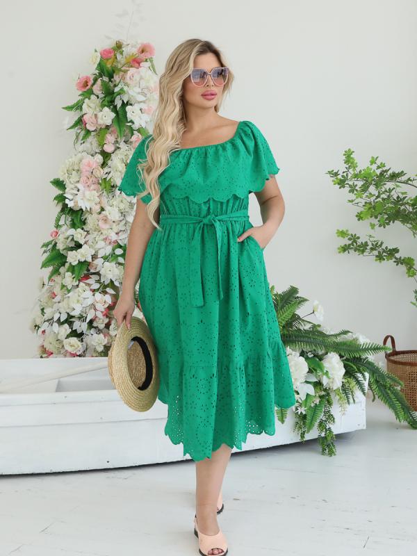 Эффектное платье полуприлегающего силуэта из текстильной ткани с вышивкой зеленого цвета. Круглый вырез обработан внтуренним швом с резинкой и эффектно подчеркнут широким воланом. Линия талии завышена и подчеркнута внутренним швом с резинкой. По низу изделия - оборка. Длина изделия по спинке от плечевого шва до низа изделия — 102 см. Рост фотомодели - 170 см.
