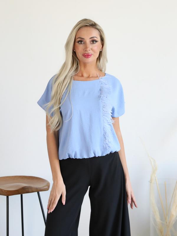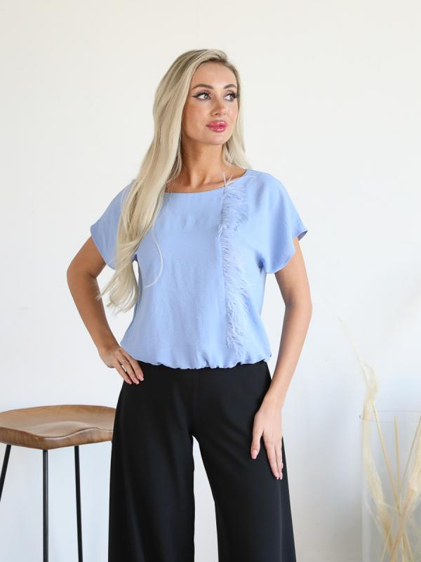 Очаровательный джемпер полуприлегающего силуэта из текстильной ткани голубого цвета. Круглый вырез изделия обработан внутренней бейкой. Джемпер с цельнокроеными рукавами. Перед изделия дополнен декоративной тесьмой "
