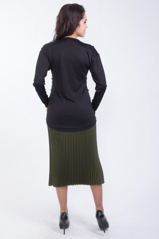 Восхитительная юбка полуприлегающего силуэта из гофрированного текстильного полотна черного цвета. Верхний край изделия обработан поясом с резинкой. Нижний край юбки обработан швом закрутка. Аксессуары в комплект не входят. Длина от пояса до низа изделия — 70 см. Рост фотомодели — 170 см.
