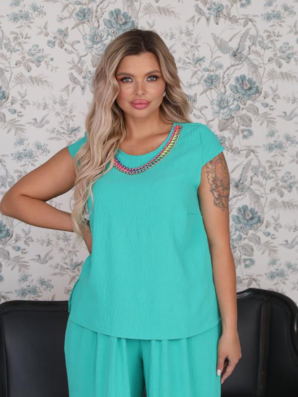 Яркий костюм прямого силуэта из текстильной ткани мятного цвета. Круглый вырез блузки обработан окантовкой и дополнен декоративной цепочкой. Проймы рукавов дополнены "