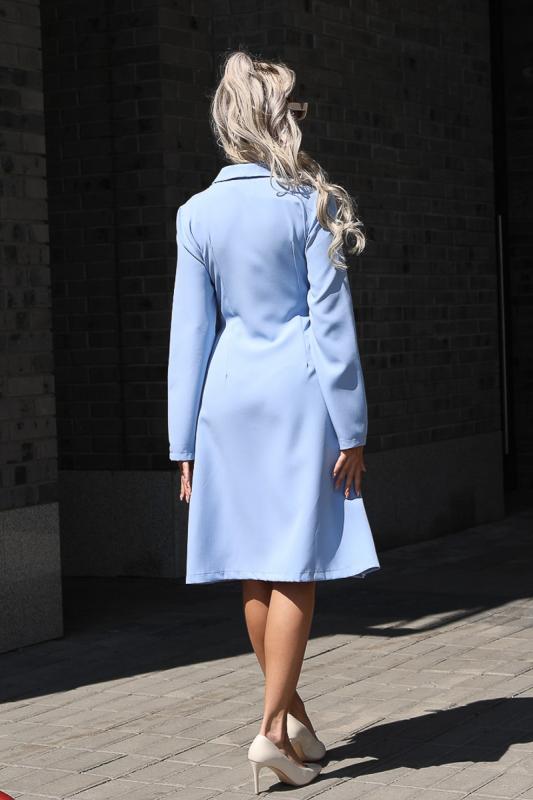 Роскошное платье полуприлегающего силуэта из текстильной ткани голубого цвета. Платье с отложным воротником и втачными рукавами. По переду изделия выполнен запах и дополнен поясом. Передняя часть юбки дополнена гофре. Длина изделия по спинке от плечевого шва до низа изделия — 100 см. Рост фотомодели — 170 см.