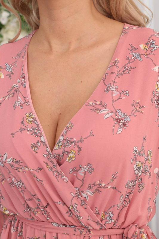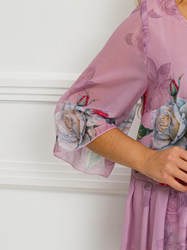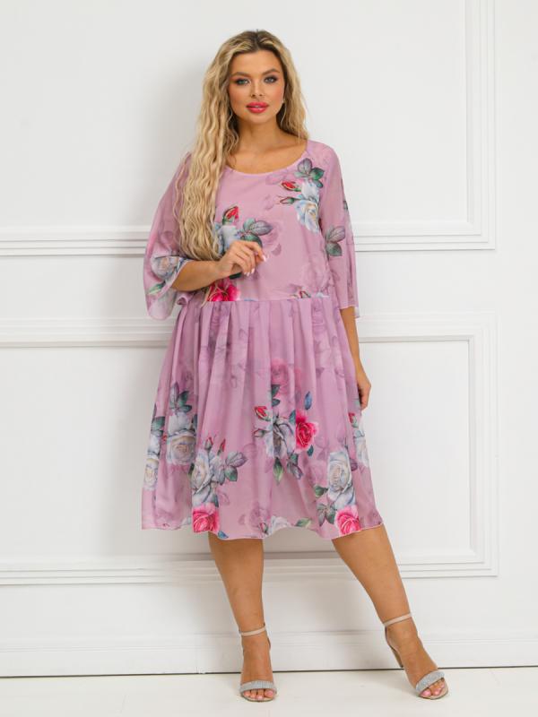 Обаятельное платье прямого силуэта из текстильного полотна розового цвета с цветочным принтом. Круглый вырез изделия обработан внутренней бейкой. Втачные рукава выполнены из шифона. Платье отрезное по линии талии. Юбка двойная: верхний слой из шифона, нижний из текстиля. По переду юбки выполнены складки. Длина изделия по спинке от плечевого шва до низа изделия — 107 см. Рост фотомодели — 170 см.