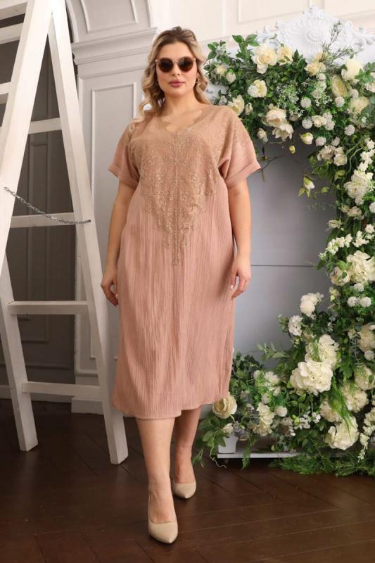 Стильное платье полуприлегающего силуэта из текстильной ткани бежевого цвета. V-образный вырез эффектно подчеркнут кружевом. Платье с цельнокроеными рукавами. Перед изделия дополнен кружевом. Длина изделия по спинке от плечевого шва до низа изделия — 119 см. Рост фотомодели — 170 см.