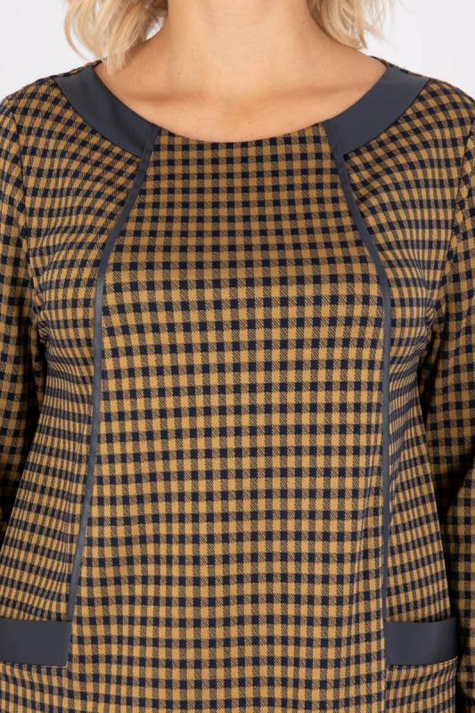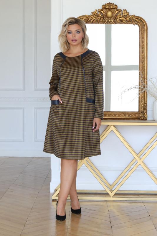 Стильное платье из трикотажного полотна полуприлегающего силуэта. Круглый вырез изделия обработан внешней обтачкой с декоративной вставкой из Эко-кожи. Платье с втачными рукавами. По переду изделия - карманы с манжетами из эко-кожи. Аксессуары в комплект не входят.Длина изделия по спинке от плечевого шва до низа изделия - 99 см. Рост фотомодели - 170 см.