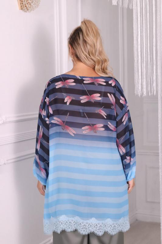 Восхитительная туника прямого силуэта из шифонового полотна голубого цвета с купоным рисунком. Круглый вырез изделия обработан внутренней бейкой. Втачные рукава обработаны окантовкой. По низу изделия кружево. Длина изделия по спинке от плечевого шва до низа изделия — 92 см. Рост фотомодели — 170 см.