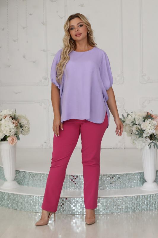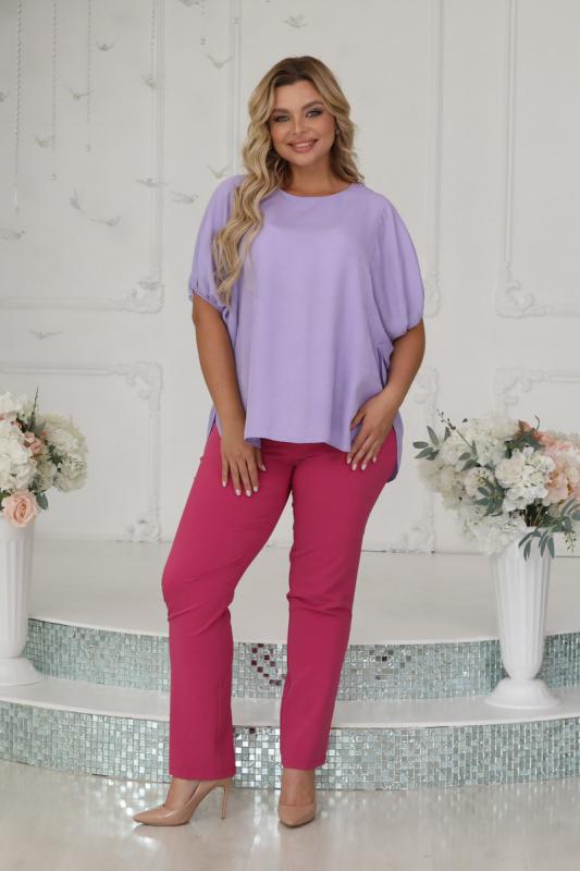 Стильные летние брюки классического кроя из текстильного полотна (креп) малинового цвета. Верхняя часть брюк обработана поясом. Передняя застежка на молнию и пуговицу. Длина изделия от линии талии до низа — 110 см..