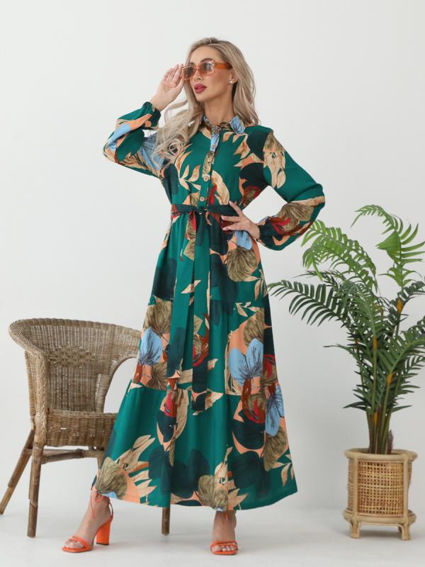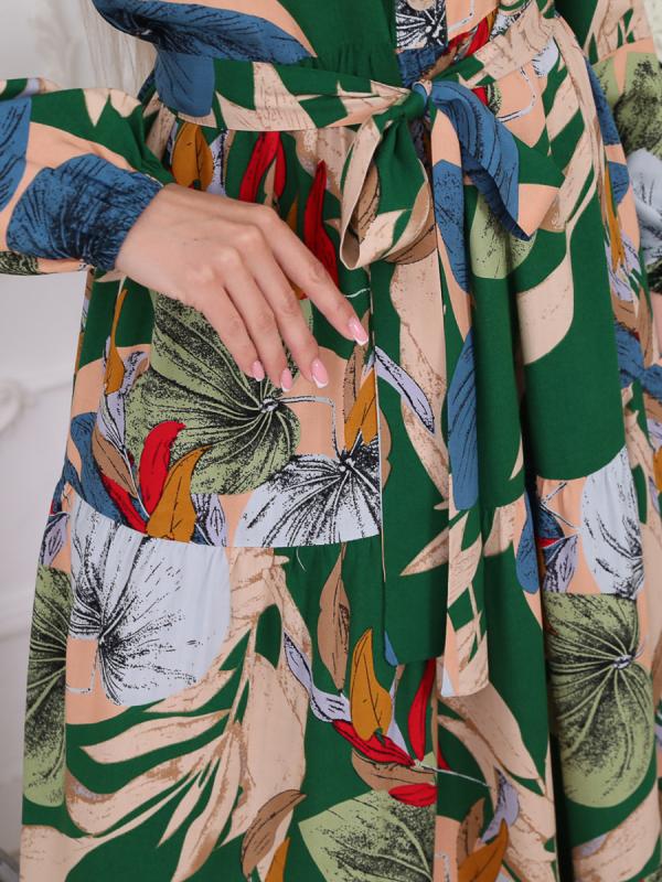 Роскошное макси-платье прямого силуэта из текстильной ткани зеленого цвета. Круглый вырез горловины обработан отложным воротником, отрезная кокетка дополнена планкой с застежкой на пуговицы. Платье с завышенной линией талии, втачные рукава обработаны окантовкой. В комплект входит пояс. Длина изделия по спинке от плечевого шва до низа изделия — 142 см. Рост фотомодели — 170 см.