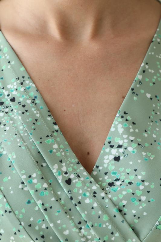 Очаровательная блузка полуприлегающего силуэта из текстильной ткани мятного цвета. V-образный вырез эффектно подчеркнут декоративными отстрочками. Блузка с цельнокроеными рукавами, по бокам изделия — разрезы. Длина изделия по спинке от плечевого шва до низа изделия - 61 см. Рост фотомодели - 170 см.