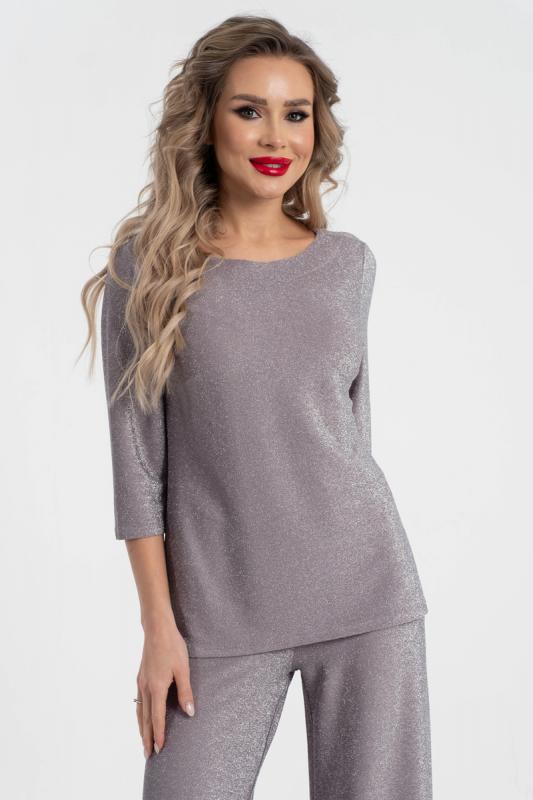 Очаровательный джемпер полуприлегающего силуэта из трикотажного полотна серого цвета с металлическим блеском. Круглый вырез изделия обработан внутренней обтачкой. Джемпер с втачными рукавами. Длина изделия от плечевого шва по спинке до низа изделия — 58 см. Рост фотомодели — 170 см.