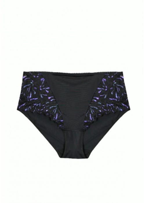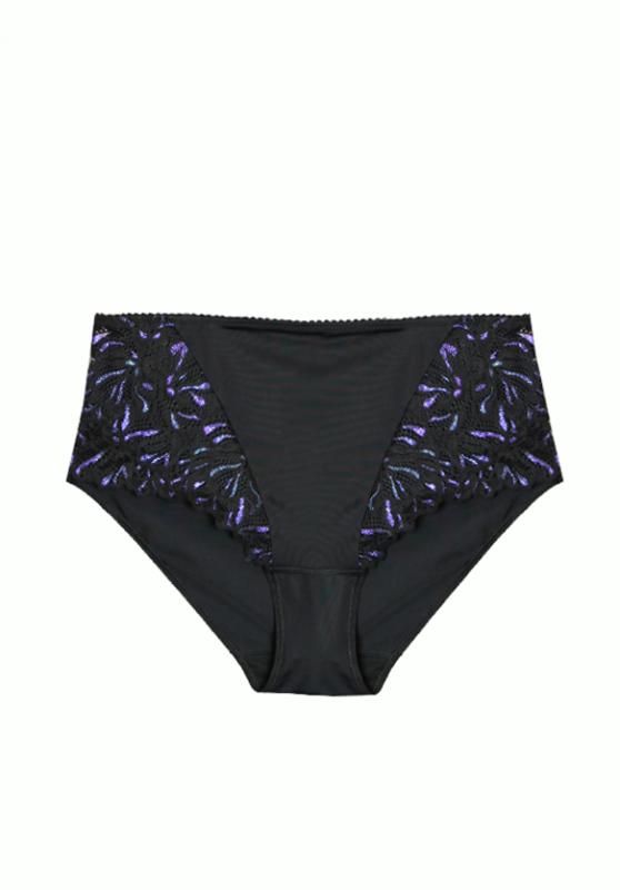 Трусы с высокой линией талии, выполненные из изысканного орнаментального кружева и одотонного полотна. Благодаря тончайшей нити люрекса кружево наполнено деликатным мерцанием, которое оживает при каждом движении, подобно сиянию звезд в ночном небе.