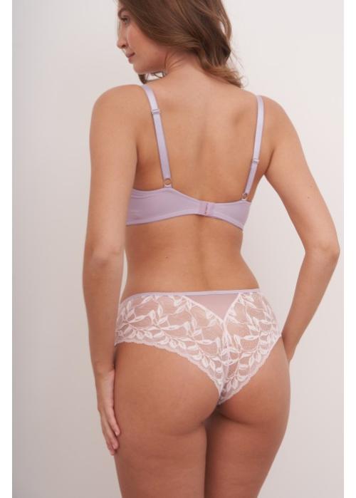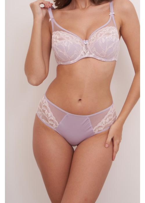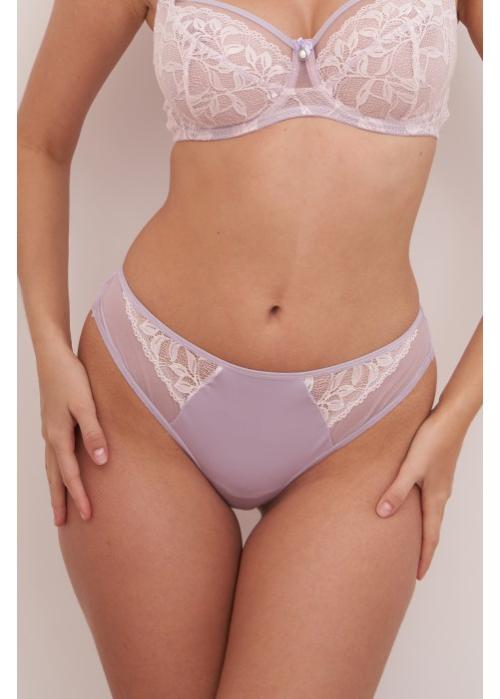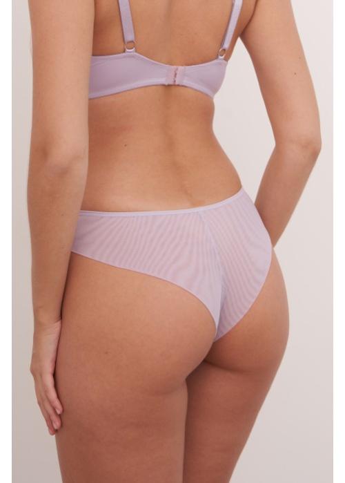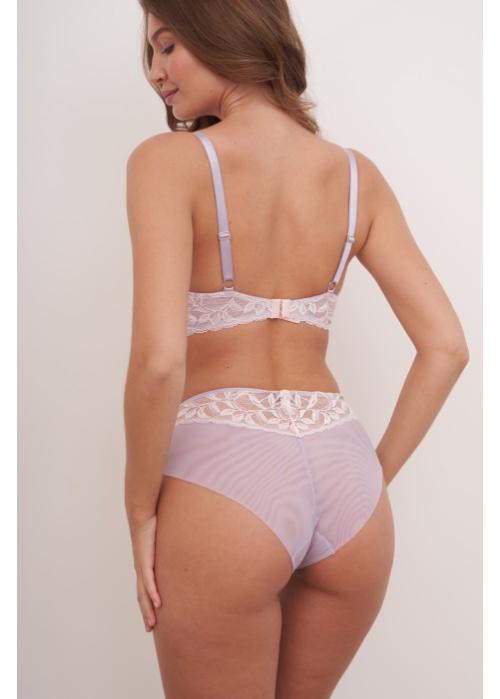 Изящные трусы-слип нежного сиреневого оттенка, украшенные изысканным кружевом. Задняя часть выполнена из мягкого, воздушного сетчатого материала, который нежно облегает тело, обеспечивая комфорт и свободу движений. Бесшовный край гарантирует абсолютную незаметность под любой облегающей одеждой, позволяя чувствовать себя уверенно и элегантно в любой ситуации.