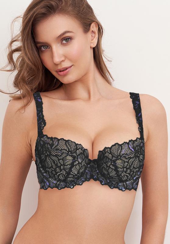 Бюстгальтер спуш-ап, выполненный из изысканного кружева. Глубокий черный цвет и холодное сияние сплетаются в этой модели, создавая образ, полный загадки. Благодаря тончайшей нити люрекса кружево наполнено деликатным мерцанием, которое оживает при каждом движении, подобно сиянию звезд в ночном небе. Это белье дарит чувство исключительности, виртуозно сочетая в себе безупречный комфорт и ослепительную элегантность.
