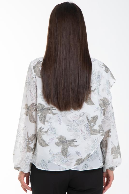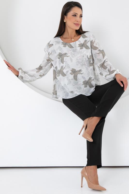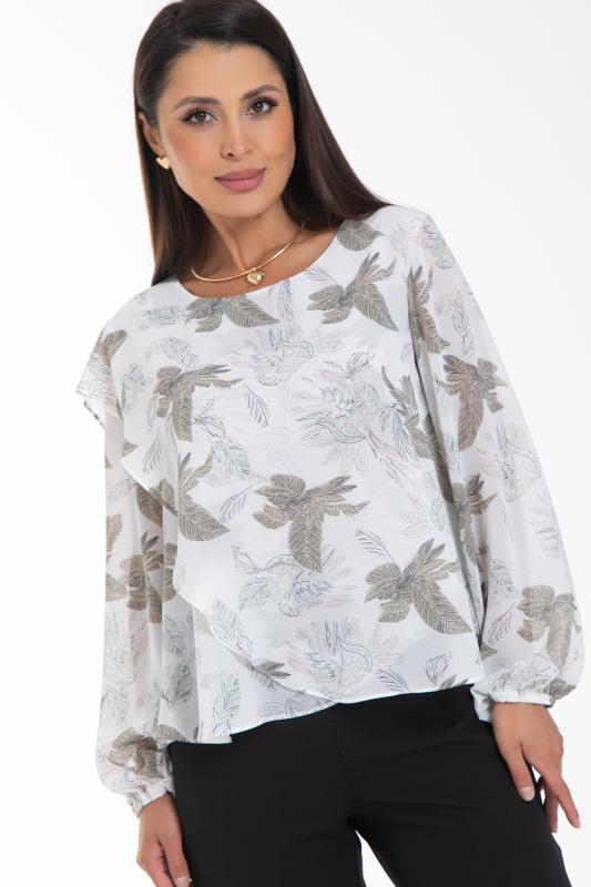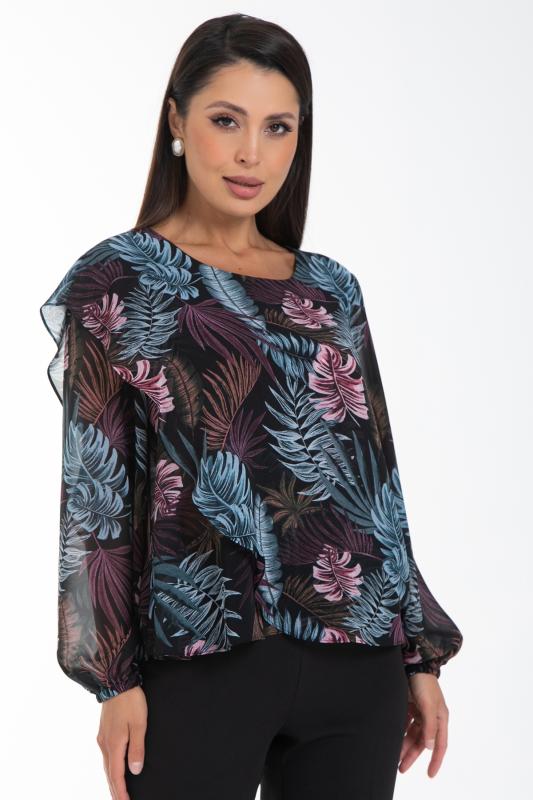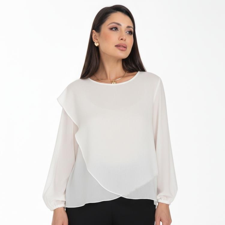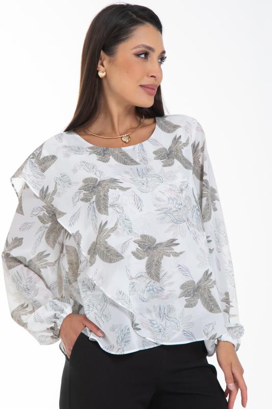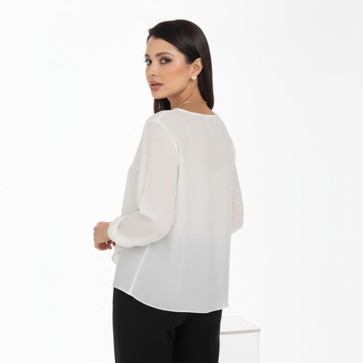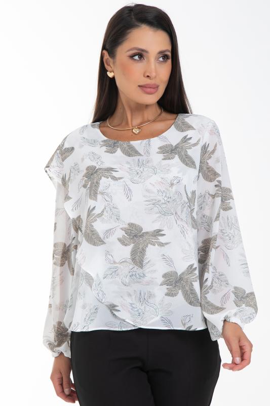 Изысканная блузка, сотканная из очарования. Уникальная жаккардовая фактура шифона придает легкому полотну благородную объемность, игру света и тени, создавая эффект роскошной ткани. Это та деталь, которая превращает простое изделие в предмет искусства. Дизайн блузки — это воплощение современной элегантности. Её оригинальный крой с наложением драпирующих деталей создает динамичный и живописный силуэт. Одно плечо эффектно ниспадает мягким «крылышком», добавляя образу скульптурности и женственности. Длинные пышные рукава, собранные на тонкую резинку на запястье, контрастируют с лаконичной круглой горловиной, подчеркивая хрупкость шеи и линию декольте. Такие рукава дарят ощущение легкости и романтики с каждым движением.
