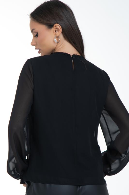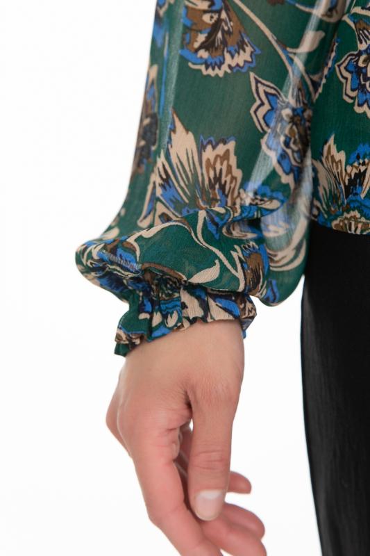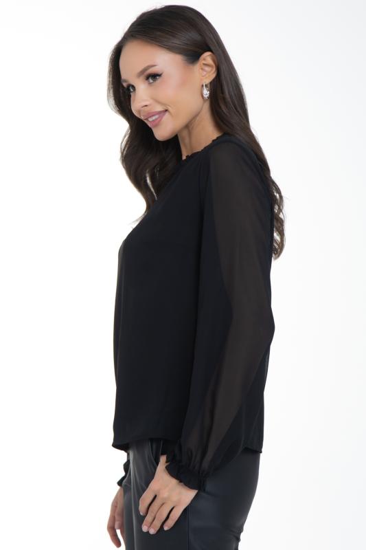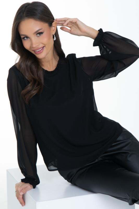 Очаровательная свободная шифоновая блузка, подчеркивающее женственность - отличное решение на каждый день или на праздник для современной стильной женщины. Шикарная модель с объемными длинными рукавами выполнена из высококачественного шифона. Круглая горловина оформлена рюшей с застежкой на пуговицу на спине. Нежная блузка из шифона на трикотажном подкладе, по переду сделаны вытачки на грудь, рукава втачные, пышные, длинные, снизу собраны на резинку.