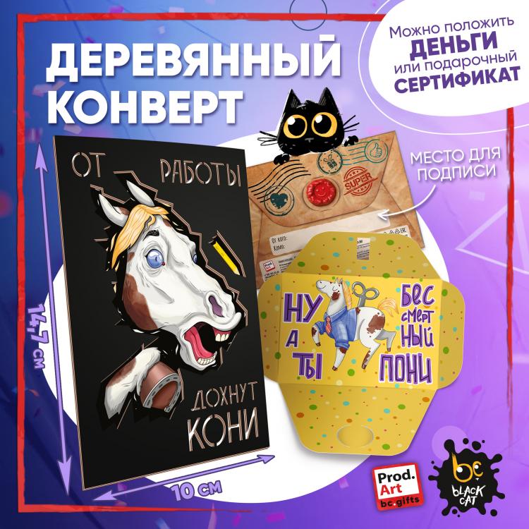 Надпись внутри конверта: Ну а ты бессмертный пони. Подарочный конверт поможет проявить внимание и красиво поздравить близкого человека. Наполнить конверт можно не только деньгами, а, например, вложить подарочный сертификат или записку с искренним посланием. Стильное оформление с деревянной вставкой превратит подарок в приятный сюрприз! Конверты украшены авторскими иллюстрациями, тёплыми пожеланиями и забавными фразами. В ассортименте представлены дизайны для разных поводов. Каждый конверт упакован в индивидуальный полиэтиленовой пакет.