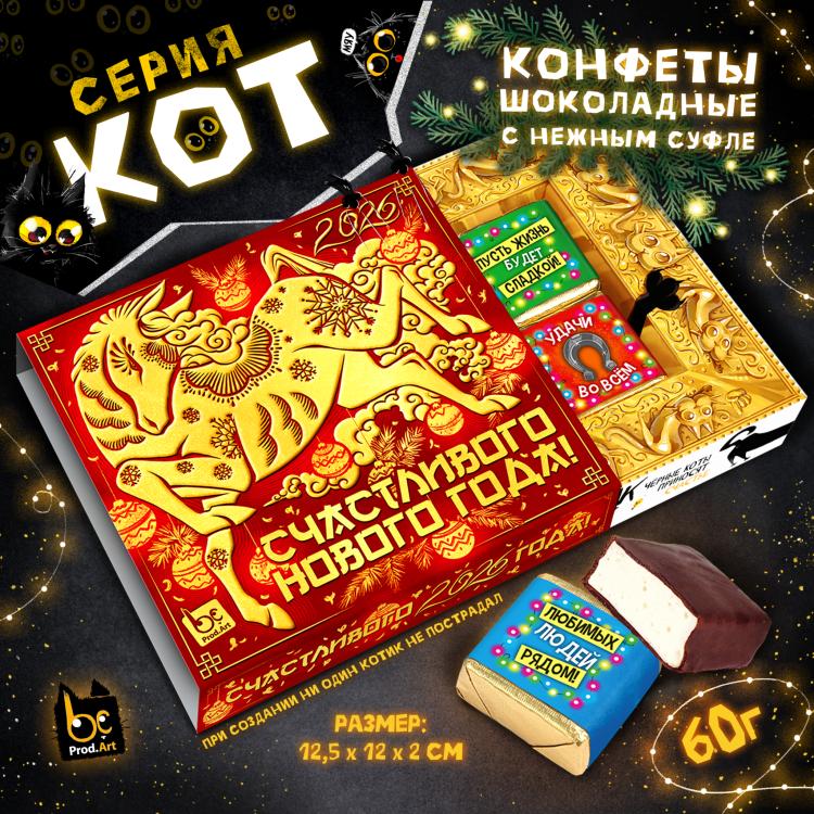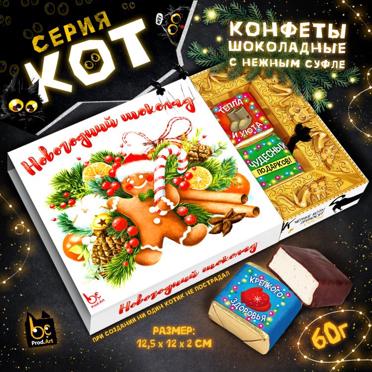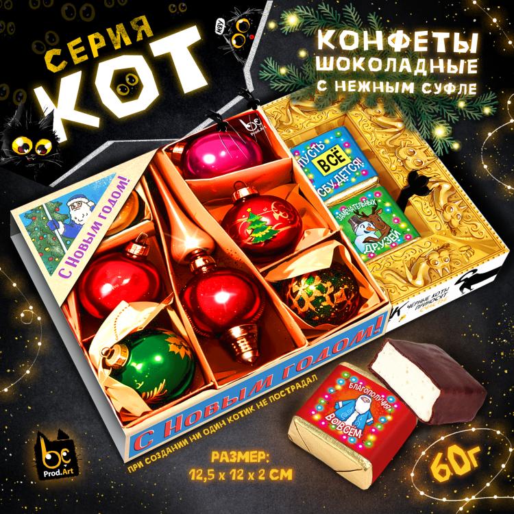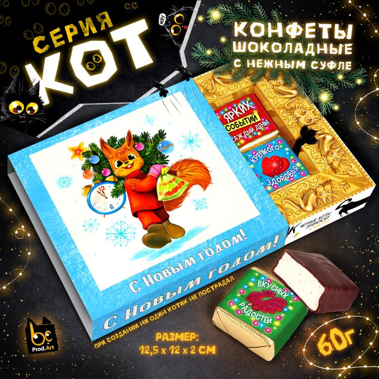 Без кота и жизнь не та! Ни один праздник не обходится без этого чудесного подарка! Внутри конфеты с нежным сливочно-ванильным суфле. Каждая конфета имеет свою яркую этикетку с очаровательными новогодними персонажами и приятными пожеланиями. Удобный формат и яркий дизайн не оставят равнодушным получателя. Может быть как самостоятельным презентом, так и дополнением к основному подарку. Универсальный размер коробочки поместится на любой витрине.&