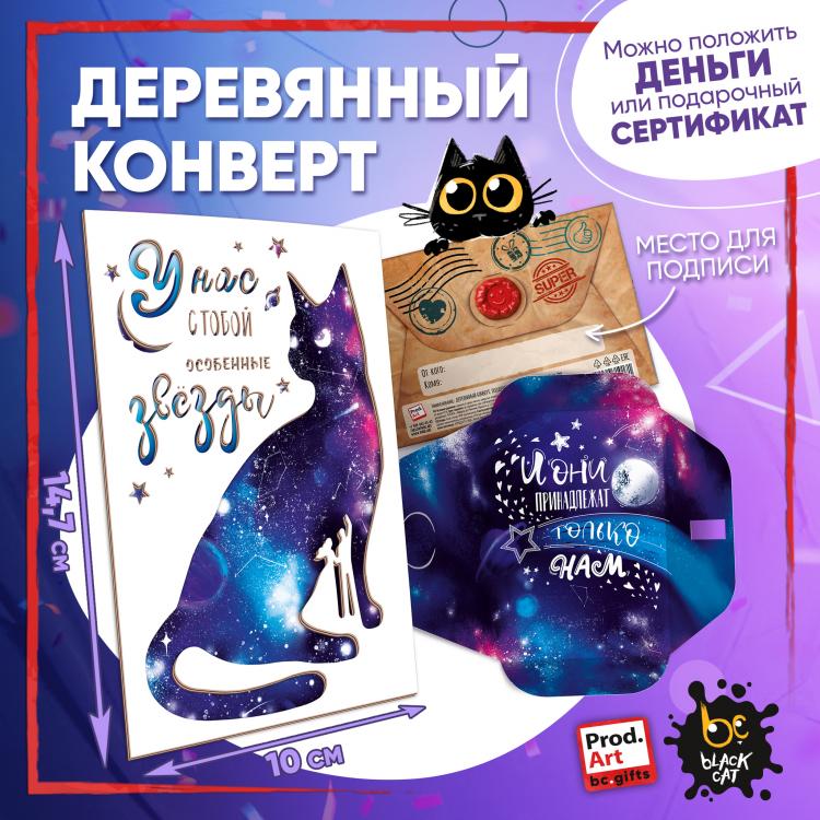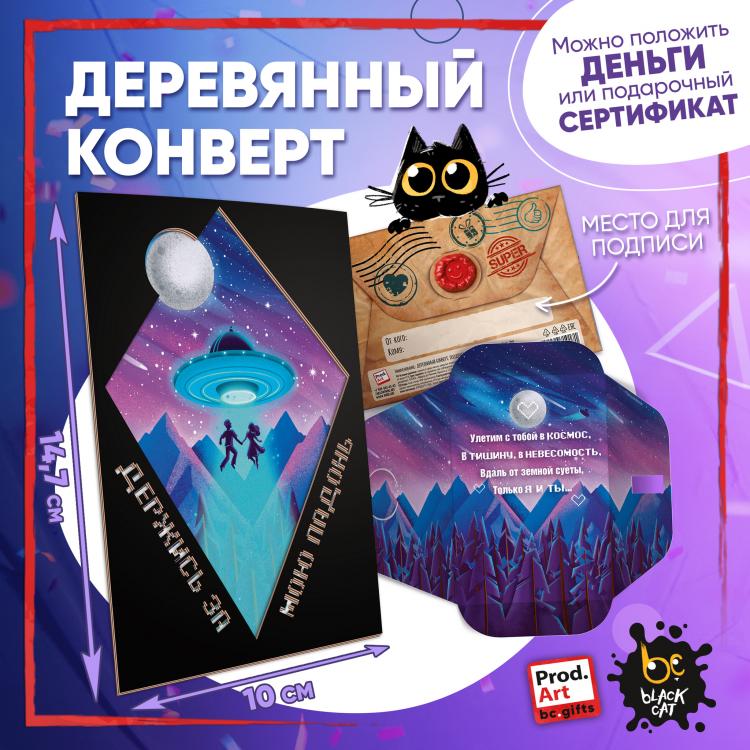 Надпись внутри конверта: Улетим с тобой в космос, в тишину, в невесомость, вдаль от земной суеты, только я и ты. Подарочный конверт поможет проявить внимание и красиво поздравить близкого человека. Наполнить конверт можно не только деньгами, а, например, вложить подарочный сертификат или записку с искренним посланием. Стильное оформление с деревянной вставкой превратит подарок в приятный сюрприз! Конверты украшены авторскими иллюстрациями, тёплыми пожеланиями и забавными фразами. В ассортименте представлены дизайны для разных поводов. Каждый конверт упакован в индивидуальный полиэтиленовой пакет.