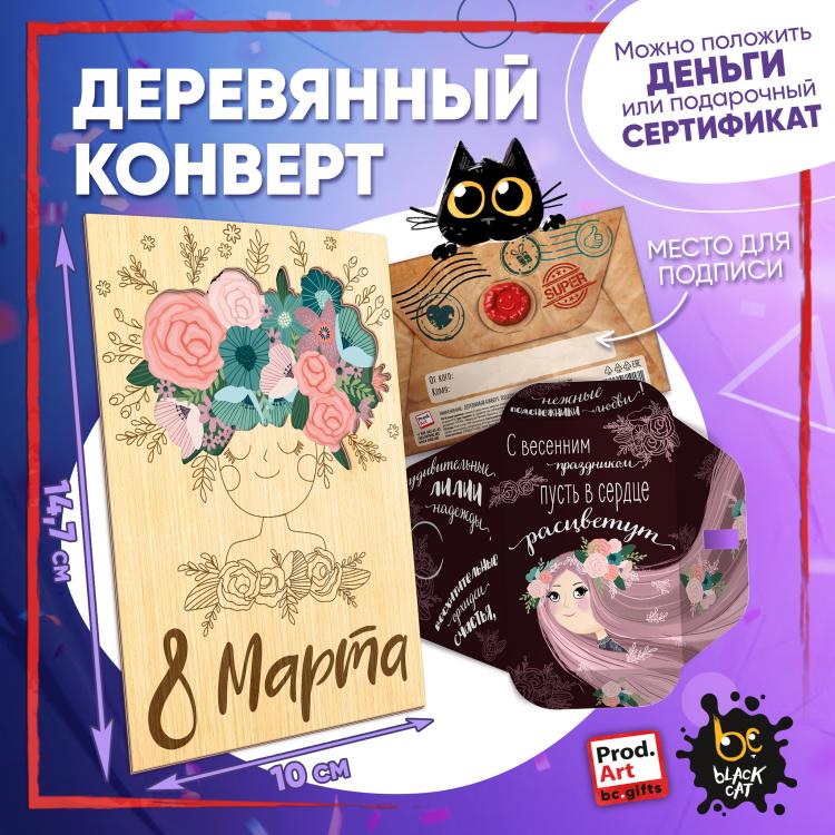 Надпись внутри конверта: С весенним праздником пусть в сердце расцветут нежные подснежники любви, удивительные лилии надежды, восхитительные орхидеи счастья&