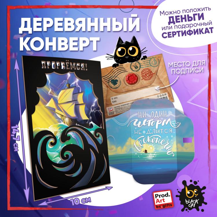 Надпись внутри конверта: Ни один шторм не длится бесконечно! Подарочный конверт поможет проявить внимание и красиво поздравить близкого человека. Наполнить конверт можно не только деньгами, а, например, вложить подарочный сертификат или записку с искренним посланием. Стильное оформление с деревянной вставкой превратит подарок в приятный сюрприз! Конверты украшены авторскими иллюстрациями, тёплыми пожеланиями и забавными фразами. В ассортименте представлены дизайны для разных поводов. Каждый конверт упакован в индивидуальный полиэтиленовой пакет.