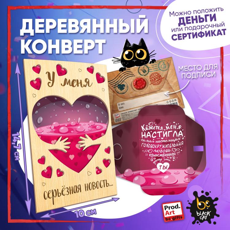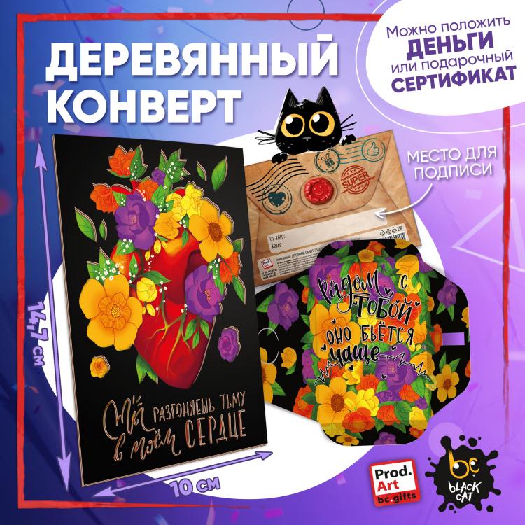 Надпись внутри конверта: Рядом с тобой оно бьется чаще. Подарочный конверт поможет проявить внимание и красиво поздравить близкого человека. Наполнить конверт можно не только деньгами, а, например, вложить подарочный сертификат или записку с искренним посланием. Стильное оформление с деревянной вставкой превратит подарок в приятный сюрприз! Конверты украшены авторскими иллюстрациями, тёплыми пожеланиями и забавными фразами. В ассортименте представлены дизайны для разных поводов. Каждый конверт упакован в индивидуальный полиэтиленовой пакет.