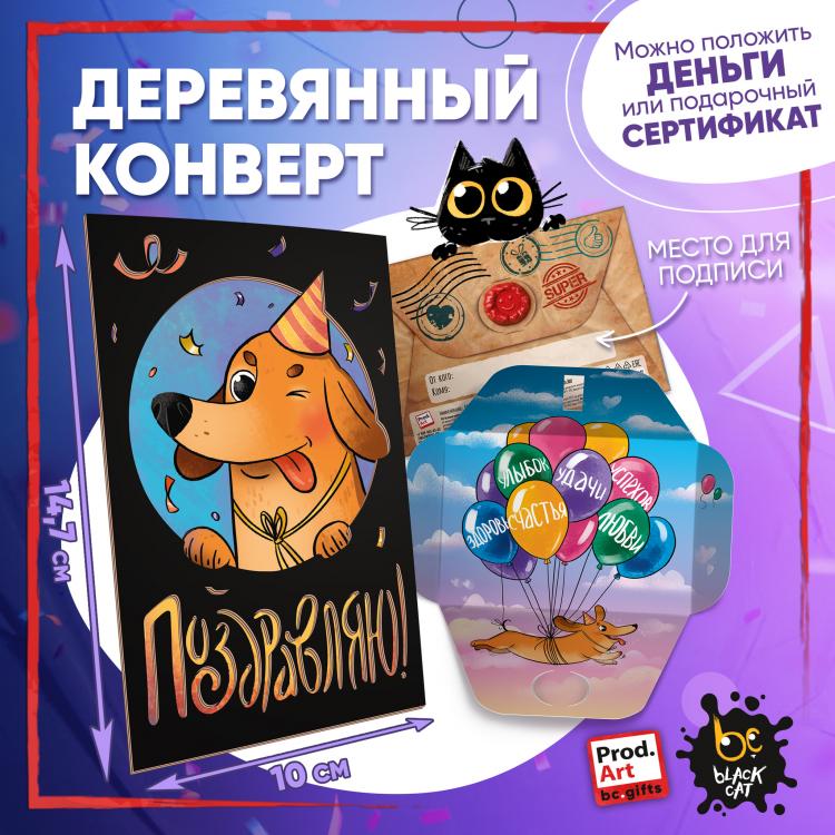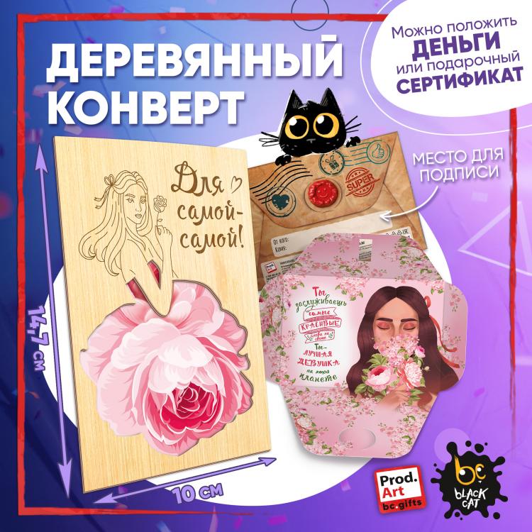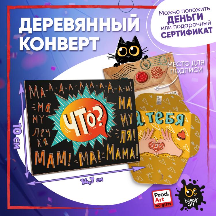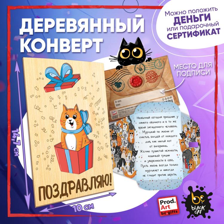 Надпись внутри конверта: Необычный сегодня праздник у самого обычного и в то же время загадочного человека. Мурлыкай по жизни от счастья, балдей от каждого дня, как милый кот от валерианы. Желаю пушистой нежности, кошачей грации и уверенности в себе. Пусть жизнь всегда только мурлыкает и никогда не гладит против шерсти. Подарочный конверт поможет проявить внимание и красиво поздравить близкого человека. Наполнить конверт можно не только деньгами, а, например, вложить подарочный сертификат или записку с искренним посланием. Стильное оформление с деревянной вставкой превратит подарок в приятный сюрприз! Конверты украшены авторскими иллюстрациями, тёплыми пожеланиями и забавными фразами. В ассортименте представлены дизайны для разных поводов. Каждый конверт упакован в индивидуальный полиэтиленовой пакет.
