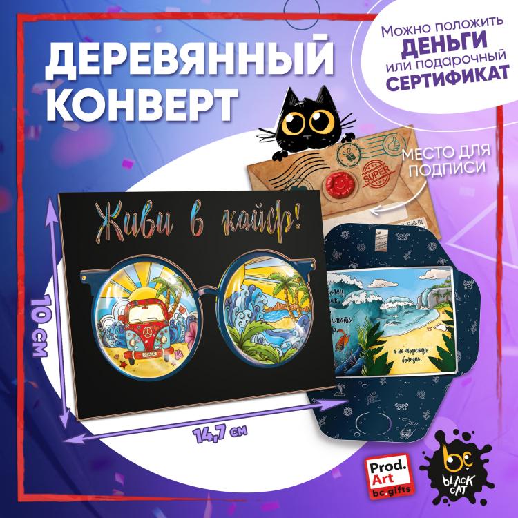 Надпись внутри конверта: Лови волну так, чтобы поймать кайф, а не морскую болезнь. Подарочный конверт поможет проявить внимание и красиво поздравить близкого человека. Наполнить конверт можно не только деньгами, а, например, вложить подарочный сертификат или записку с искренним посланием. Стильное оформление с деревянной вставкой превратит подарок в приятный сюрприз! Конверты украшены авторскими иллюстрациями, тёплыми пожеланиями и забавными фразами. В ассортименте представлены дизайны для разных поводов. Каждый конверт упакован в индивидуальный полиэтиленовой пакет.