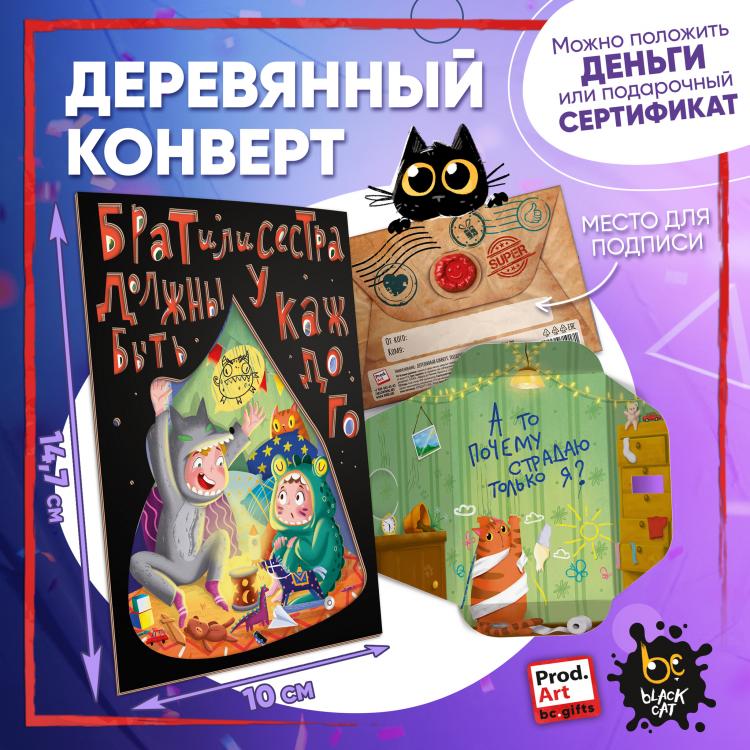 Надпись внутри конверта: А то почему страдаю только я? Подарочный конверт поможет проявить внимание и красиво поздравить близкого человека. Наполнить конверт можно не только деньгами, а, например, вложить подарочный сертификат или записку с искренним посланием. Стильное оформление с деревянной вставкой превратит подарок в приятный сюрприз! Конверты украшены авторскими иллюстрациями, тёплыми пожеланиями и забавными фразами. В ассортименте представлены дизайны для разных поводов. Каждый конверт упакован в индивидуальный полиэтиленовой пакет.