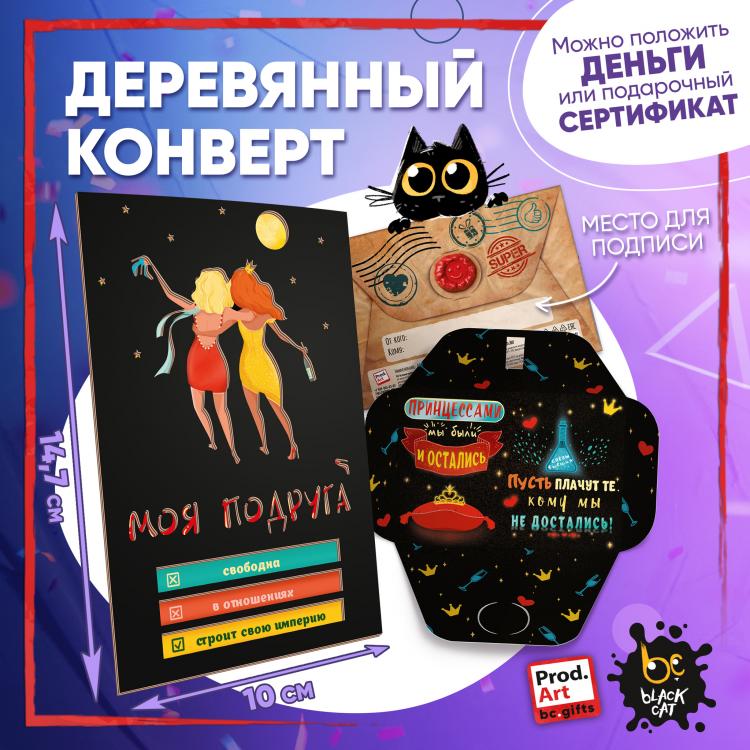 Надпись внутри конверта: Принцессами мы были и остались, пусть плачут те, кому мы не достались. Подарочный конверт поможет проявить внимание и красиво поздравить близкого человека. Наполнить конверт можно не только деньгами, а, например, вложить подарочный сертификат или записку с искренним посланием. Стильное оформление с деревянной вставкой превратит подарок в приятный сюрприз! Конверты украшены авторскими иллюстрациями, тёплыми пожеланиями и забавными фразами. В ассортименте представлены дизайны для разных поводов. Каждый конверт упакован в индивидуальный полиэтиленовой пакет.