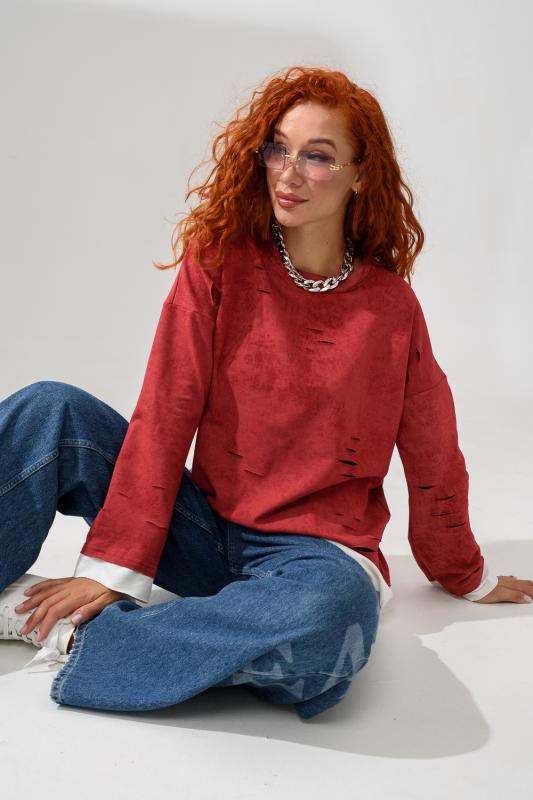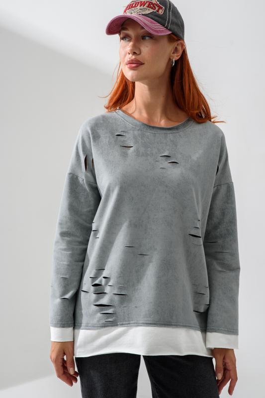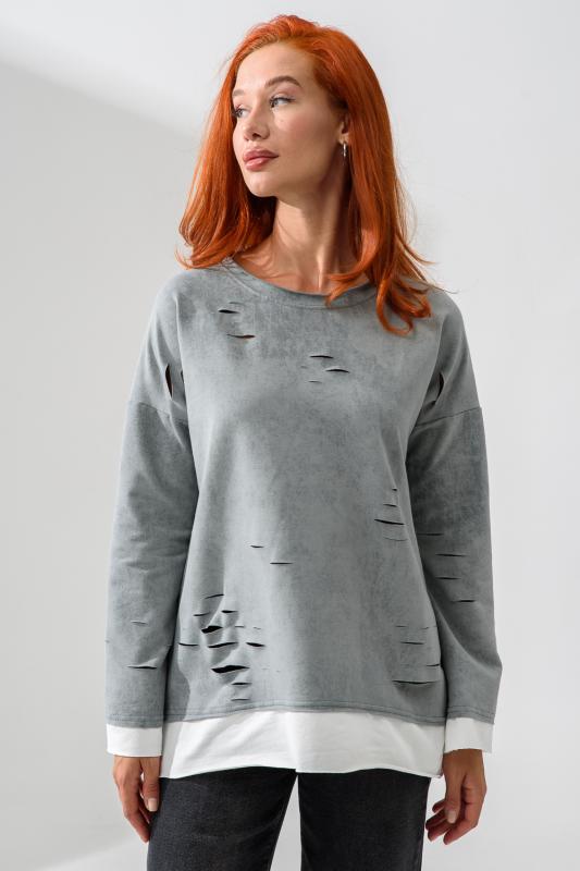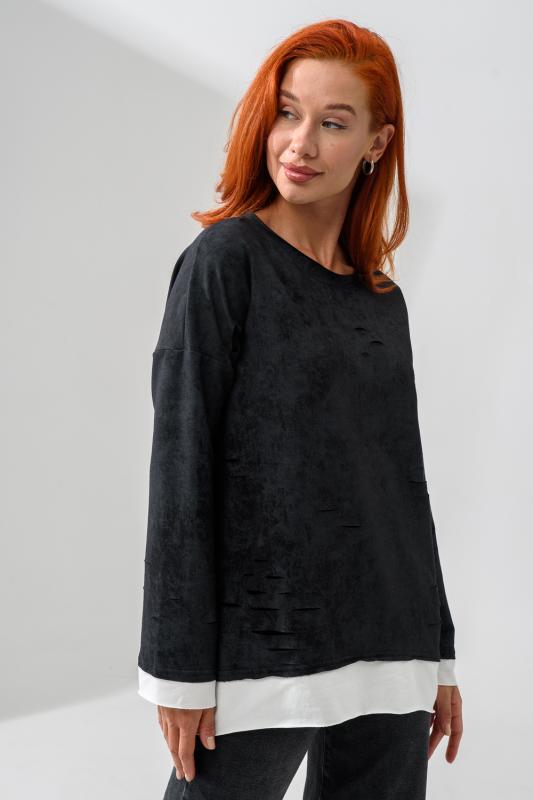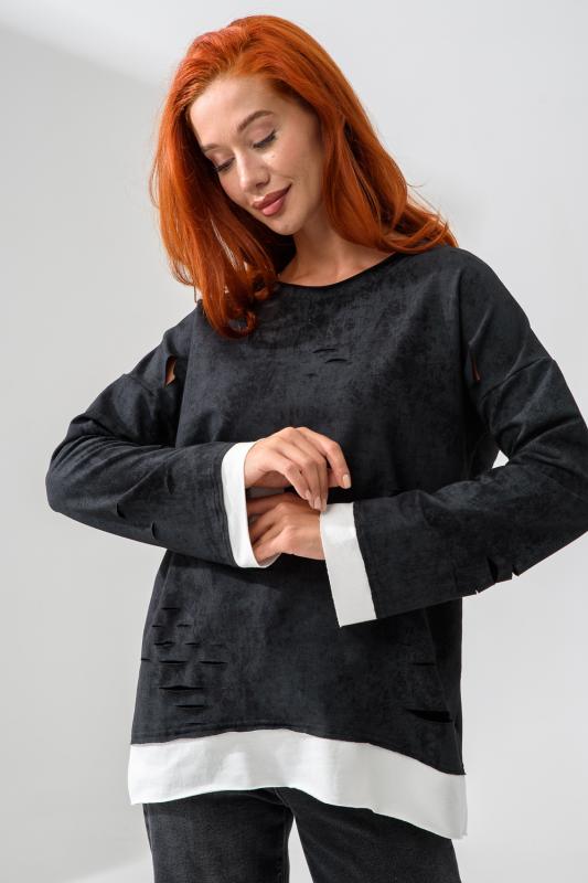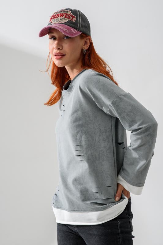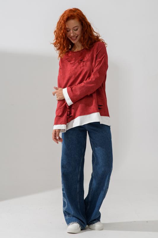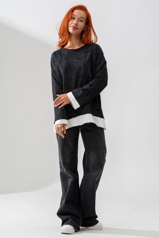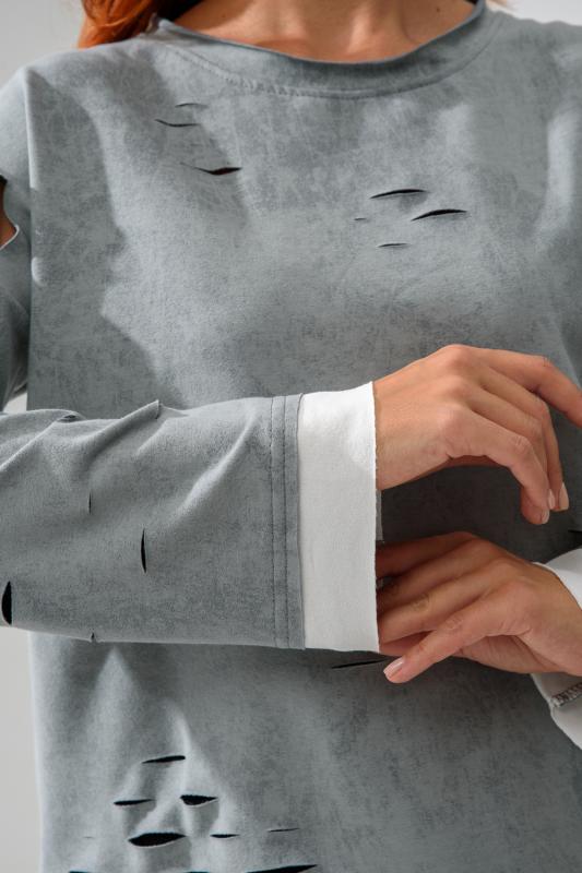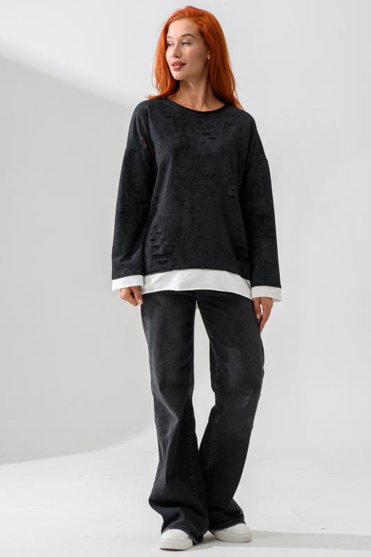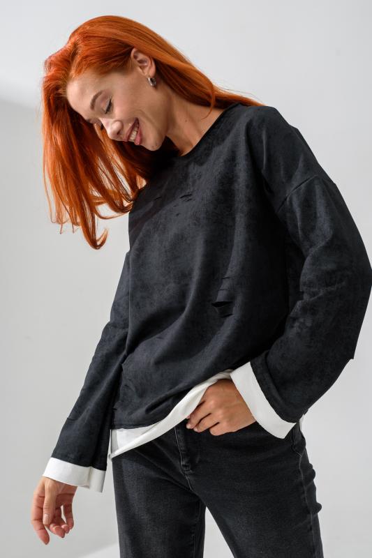 Женский лонгслив свободного кроя - эксклюзивная разработка с эффектом второго слоя. Очень современный дизайн! Особое внимание уделено деталям: необработанная горловина, края рукавов и низа, эффект многослойности придает изделию современный минимализм.