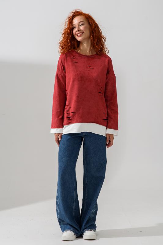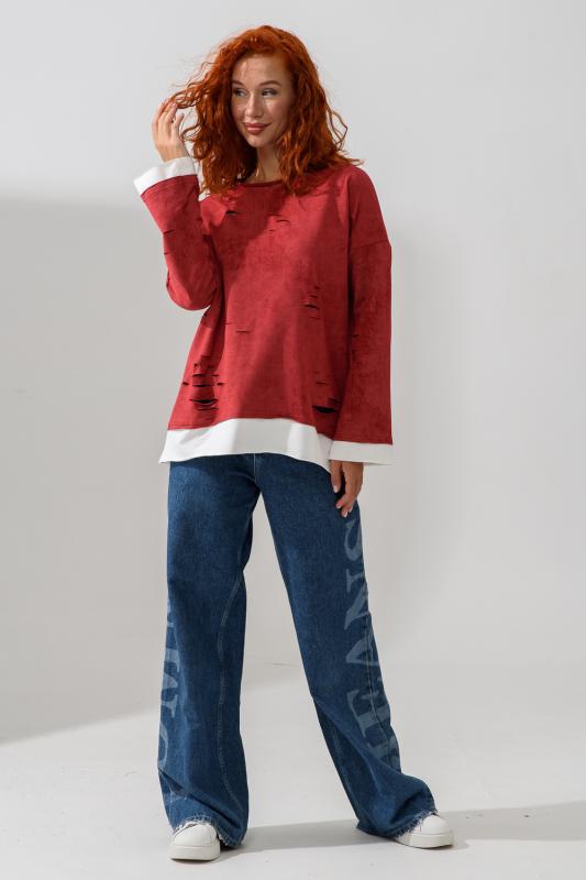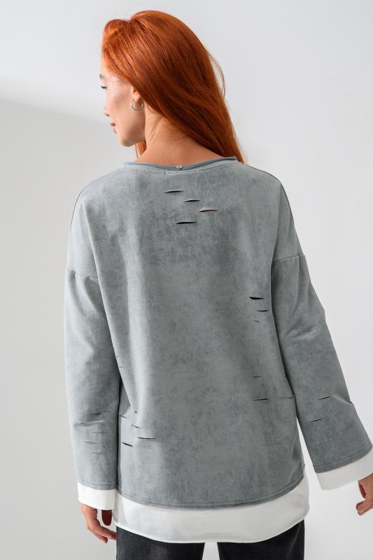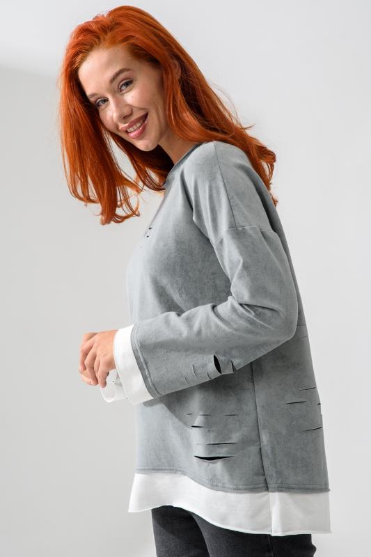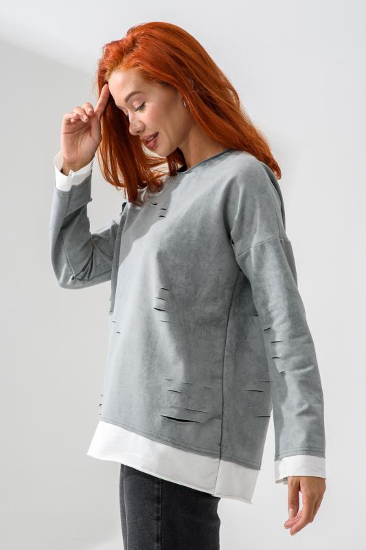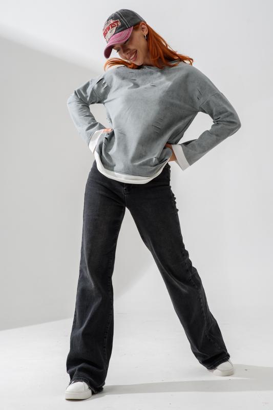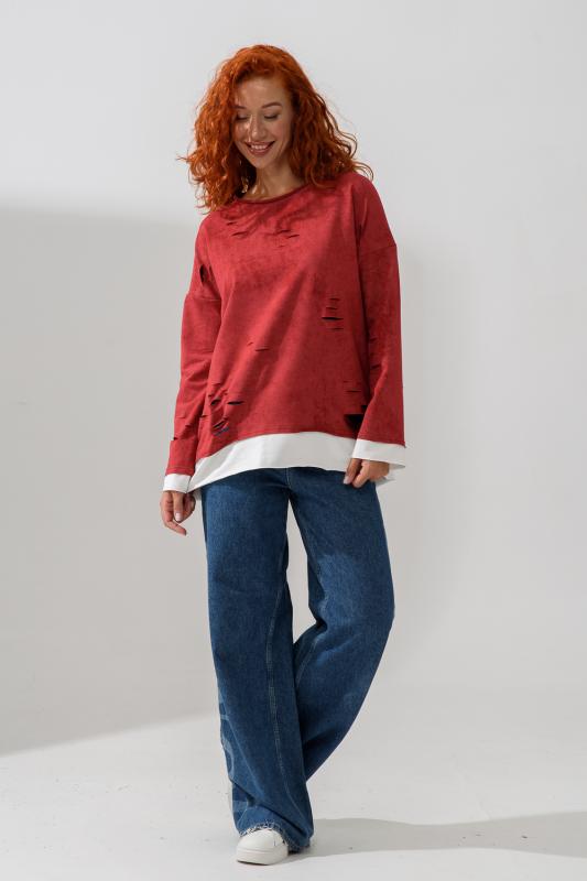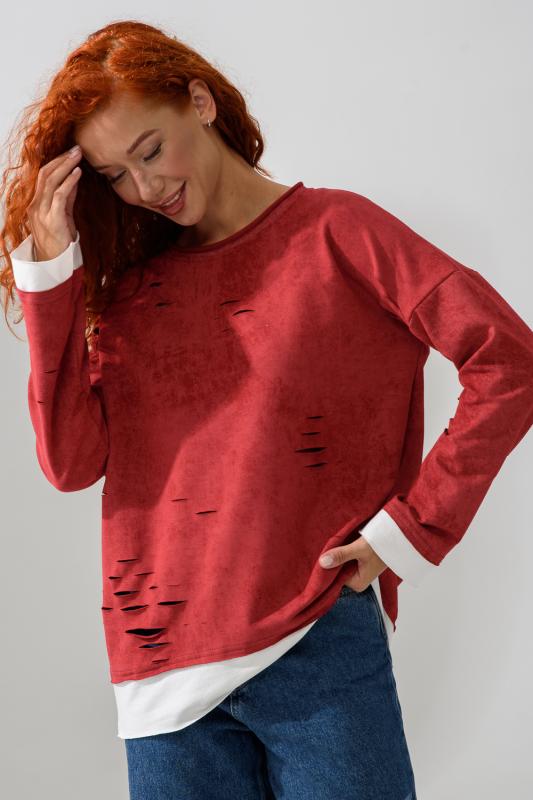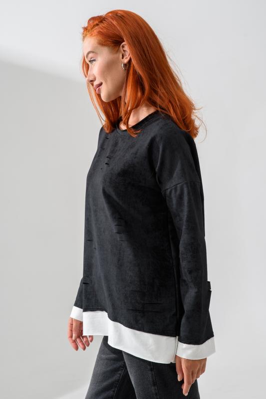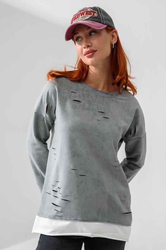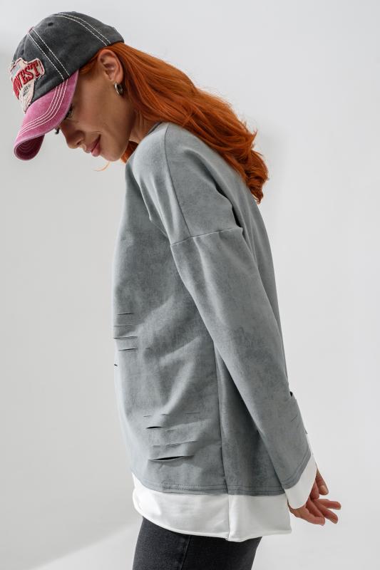 Женский лонгслив свободного кроя - эксклюзивная разработка с эффектом второго слоя. Очень современный дизайн! Особое внимание уделено деталям: необработанная горловина, края рукавов и низа, эффект многослойности придает изделию современный минимализм.